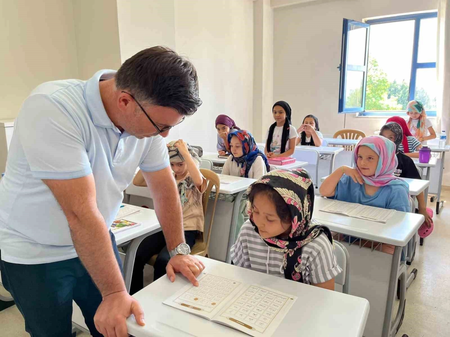 DÜZCE(İHA) – Düzce Bahçeşehir Gençlik Merkezi’nde çocuklar Yaz Okullarında hem öğreniyor hem de eğeleniyor. Gençlik ve spor Müdürü İsa Yazıcı öğrencilerle bir araya geldi.Düzce Gençlik ve Spor İl Müdürü İsa Yazıcı, Bahçeşehir Gençlik Merkezi Yaz Okulu’nda verilen Kur’an-ı Kerim Dini İlimler Atölyesi, Namaz Duaları Ezber Eğitimi ile İlmihal konularını temel alan eğitimleri ziyaret etti. Kurslara katılan öğrencilere İl Müdürü İsa Yazıcı, Yaz Okulu Anı Defteri dağıttı.Ayrıca Kur’an-ı Kerim Dini İlimler Atölyesi, Namaz Duaları Ezber Eğitimi ile İlmihal konularını temel alan eğitimlerin yanı sıra Okçuluk, Taekwondo, Resim ve Filografi kursları da devam ediyor.