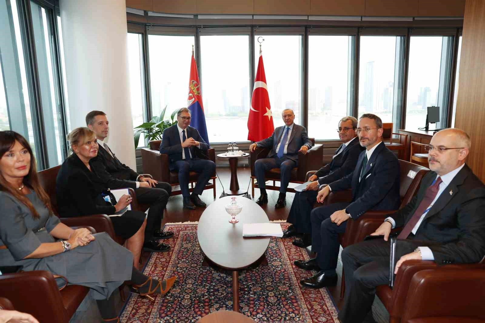 Cumhurbaşkanı Recep Tayyip Erdoğan, Birleşmiş Milletler 79. Genel Kurulu için gittiği New York’taki Türkevi’nde Sırbistan Cumhurbaşkanı Aleksandar Vucic ile bir görüşme gerçekleştirdi. Görüşmede Türkiye ile Sırbistan ikili ilişkileri, bölgesel ve küresel meseleler değerlendirildi.Cumhurbaşkanı Erdoğan görüşmede, Türkiye ile Sırbistan arasındaki ilişkilerin her alanda güçlenmeye devam ettiğini, iş birliği alanlarını çeşitlendirme ve geliştirmeye büyük bir kararlılık içinde devam edileceğini ayrıca Sırbistan ile Kosova arasındaki diyalog sürecinin devamının önemli olduğunu belirtti.Cumhurbaşkanı Erdoğan, Gazze’de İsrail saldırganlığı nedeniyle büyük bir insanlık dramı yaşandığını, katliamların durması için uluslararası toplumun tek ses olması gerektiğini, İsrail’in çatışmaları bölgenin tamamına yayma gayretlerinin engellenmemesi durumunda, dünya barışının daha büyük bir tehlike ile karşı karşıya kalacağını ifade etti.