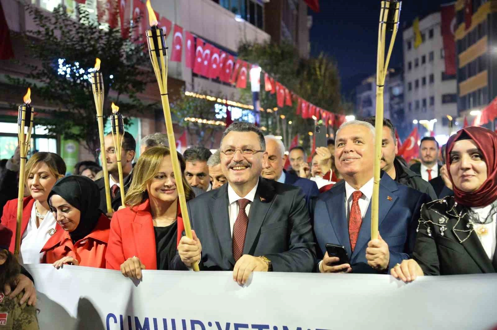Cumhuriyet’in 101. yıl dönümü kutlamaları çerçevesinde düzenlenen fener alayına katılan Büyükşehir Belediye Başkanı Ahmet Metin Genç, "Cumhuriyetimizin 101. yılını fener alayı ile coşkuyla kutladık, birliğimizi ilelebet koruyacağız" dedi.Trabzon Büyükşehir Belediye Başkanı Ahmet Metin Genç ve eşi Arzu Genç, Büyükşehir Belediyesi’nin Cumhuriyet’in 101. yıl dönümü kutlamaları çerçevesinde düzenlediği fener alayına katıldı. Etkinlikte, Trabzon Valisi Aziz Yıldırım ve eşi Güllühan Yıldırım, askeri erkan, emniyet mensupları, sivil toplum kuruluşu temsilcileri ve binlerce vatandaş yer aldı. Ellerinde meşaleler ve Türk bayraklarıyla yürüyüşe katılan vatandaşlar, Cumhuriyet’e olan bağlılıklarını ve coşkularını hep birlikte gösterdi. Cumhuriyet Bayramı’nın 101. yılını Trabzon’da coşkuyla kutlamanın gururunu yaşadıklarını ifade eden Başkan Genç, "Cumhuriyet Bayramı’mızın 101. yılını ülkemizin dört bir yanında olduğu gibi Trabzon’da da büyük bir coşkuyla kutlamanın gururunu yaşıyoruz. Atatürk Alanı’nda hemşehrilerimizle birlikte gerçekleştirdiğimiz fener alayında hep bir aradayız. Bu vesileyle, cumhuriyetimizi kuran ve bize emanet eden Gazi Mustafa Kemal Atatürk ve silah arkadaşlarını rahmetle anıyor, tüm hemşehrilerimin Cumhuriyet Bayramı’nı yürekten kutluyorum. Programımızda bir konser de vardı ancak PKK’nın hain saldırısı nedeniyle iptal ettik. TUSAŞ’ta şehit düşen evlatlarımızı bir kez daha rahmetle anıyor, bu hain terör örgütünü şiddetle kınıyorum. Bizleri bölemeyecekler; Türk milleti, köklü inancı ve vatan sevgisiyle ilelebet burada var olmaya devam edecek. Cumhuriyetimizin 101. yılını kutlarken, yanı başımızda İsrail’in masum sivillere uyguladığı zulmü ve insanlık dışı saldırılarını da görüyoruz. Savaşın dahi hukuku hiçe sayılarak çocuk, bebek, yaşlı demeden yapılan bu katliamları lanetliyoruz. Bağımsız vatan topraklarını bize emanet eden atalarımızı ve tüm şehitlerimizi rahmetle anıyoruz. Allah birliğimizi bozmasın; Cumhuriyet Bayramımız kutlu, hayırlı olsun" dedi."Emaneti yaşatmaya devam edeceğiz"Trabzon Valisi Aziz Yıldırım, “Bizler bu topraklarda iki bin yıldır varız ve birçok devlet kurduk; her biri uzun ömürlü oldu. 101 yıldır cumhuriyetle yaşıyoruz ve atalarımızın bıraktığı bu topraklar bize emanettir. Cumhuriyetimizin banisi Gazi Mustafa Kemal Atatürk ve silah arkadaşlarını rahmetle anıyorum. Bizler, geçmişte olduğu gibi bugün de bulunduğumuz topraklara huzur ve medeniyet getirdik, bu emaneti yaşatmaya devam edeceğiz. Gençler, Atatürk’ün dediği gibi, Cumhuriyet’i yaşatacak olan sizlersiniz. Bu akşam fener alayını düzenleyen ve katılan herkese teşekkür ederim. Cumhuriyet Bayramımız kutlu olsun, nice yüz bir yıllara” diye konuştu.