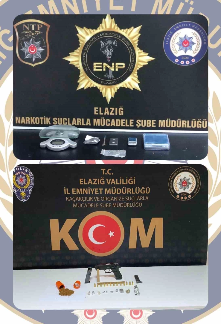 Elazığ’da polis ekiplerinin uyuşturucu ile mücadele çerçevesinde yaptığı çalışmalarda 4 şüpheli tutuklandı.Elazığ Cumhuriyet Başsavcılığı koordinesinde İl Emniyet Müdürlüğü Kaçakçılık ve Organize Suçlarla Mücadele ve Narkotik Suçlarla Mücadele Şube Müdürlüğü tarafından yapılan çalışmalarda; 4 şüpheli şahıs yakalandı. Yapılan aramalarda; 1 adet ruhsatsız tabanca ve tabancaya ait 13 adet fişek, 97,88 gram Sentetik Kannabinoid maddesi, 24,39 gram Metamfetamin maddesi, 4.33 gram esrar maddesi, 5 adet Extacy hap ve 3 adet hassas terazi ele geçirildi.Ayrıca narkotik suçlardan kesinleşmiş hapis cezası olan 3 şahıs yakalandı. Adliyeye sevk edilen 7 şüpheliden 4’ü tutuklanırken 3’üne ise adli kontrol kararı verildi.