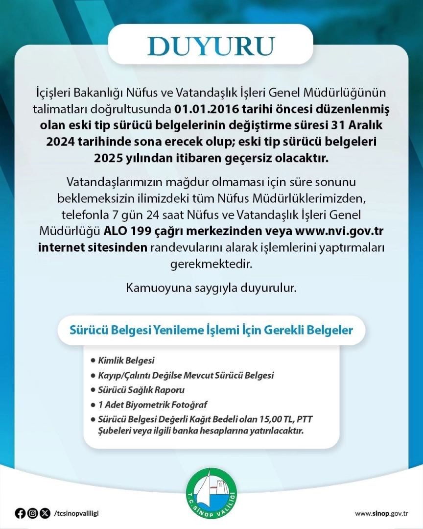 Sinop Valiliği, eski tip sürücü belgelerinin değiştirilme süresinin 31 Aralık 2024 tarihinde sona ereceği uyarısında bulundu.Sinop Valiliğinden yapılan açıklamada, "İçişleri Bakanlığı Nüfus ve Vatandaşlık İşleri Genel Müdürlüğünün talimatları doğrultusunda 01.01.2016 tarihi öncesi düzenlenmiş olan eski tip sürücü belgelerinin değiştirme süresi 31 Aralık 2024 tarihinde sona erecek olup; eski tip sürücü belgeleri 2025 yılından itibaren geçersiz olacaktır. Vatandaşlarımızın mağdur olmaması için süre sonunu beklemeksizin ilimizdeki tüm nüfus müdürlüklerimizden, telefonla 7 gün 24 saat Nüfus ve Vatandaşlık İşleri Genel Müdürlüğü çağrı merkezinden veya internet sitesinden randevularını alarak işlemlerini yaptırmaları gerekmektedir. Kimlik belgesi, kayıp, çalıntı değilse mevcut sürücü belgesi, sürücü sağlık raporu, 1 adet biyometrik fotoğraf, sürücü belgesi değerli kağıt bedeli olan 15 TL, PTT şubeleri veya ilgili banka hesaplarına yatırılacaktır” denildi.