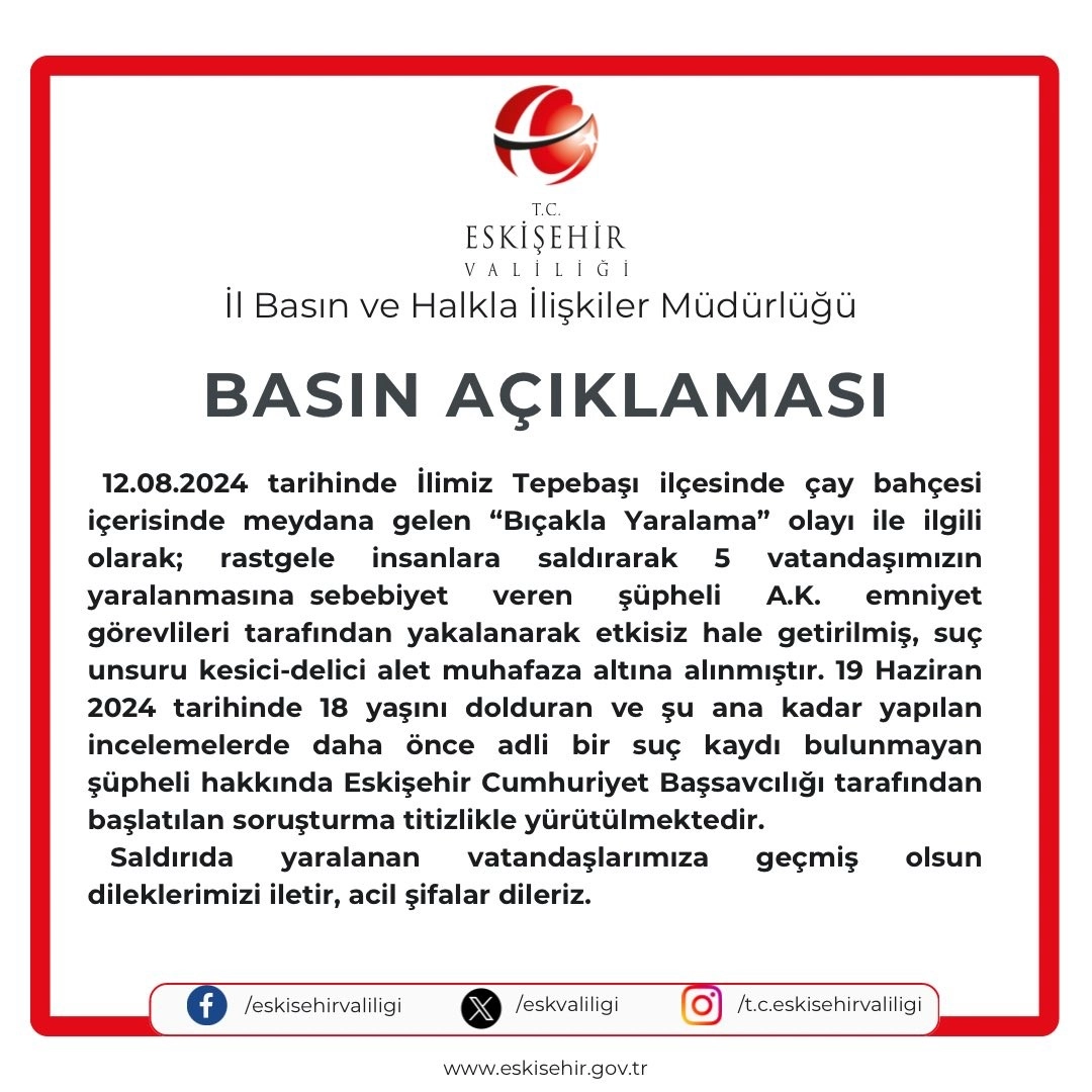 Eskişehir’de çay bahçesinde oturan vatandaşlara yönelik gerçekleşen bıçaklı saldırıyla ilgili Eskişehir Valiliği açıklama yaptı.Tepebaşı İlçesi Uluönder Mahallesi’nde bulunan bir çay ocağında meydana gelen olayda, 18 yaşındaki Arda K. isimli şahıs vatandaşlara elindeki bıçakla saldırdı. Savaş oyunu karakterini andıran giyimiyle gerçekleştirdiği saldırıda 5 kişi bıçaklanarak yaralandı. Olayın ardından şüpheli gözaltına alındı. Olayla ilgili Eskişehir Valiliği tarafından açıklama yapıldı. Yapılan açıklamada şu ifadelere yer verildi:“12.08.2024 tarihinde ilimiz Tepebasi ilçesinde çay bahçesi içerisinde meydana gelen ’Bıçakla Yaralama’ olayı ile ilgili olarak; rastgele insanlara saldırarak 5 vatandaşımızın yaralanmasına sebebiyet veren şüpheli A.K. emniyet görevlileri tarafından yakalanarak etkisiz hale getirilmiş, suç unsuru kesici-delici alet muhafaza altına alınmıştır. 19 Haziran 2024 tarihinde 18 yaşını dolduran ve şu ana kadar yapılan incelemelerde daha önce adli bir suç kaydı bulunmayan şüpheli hakkında Eskişehir Cumhuriyet Başsavcılığı tarafından başlatılan soruşturma titizlikle yürütülmektedir. Saldırıda yaralanan vatandaşlarımıza geçmiş olsun dileklerimizi iletir, acil şifalar dileriz.”