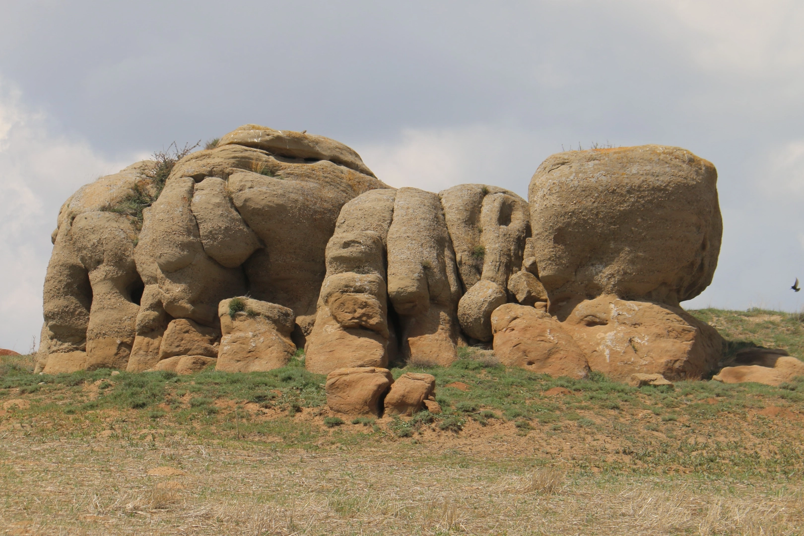 Sivas'ın Altınyayla ilçesinde bulunan kayalar, görünümüyle dikkat çekiyor. Güzeloğlan Mahallesi'nde tarım arazilerinin ortasında yer alan kayalar, birçok figüre benzetiliyor. Yoldan geçenlerin ilgisini çeken bozkırın ortasındaki kayalar, birçok kişi tarafından fil ailesine benzetiliyor. İlginç yapıya sahip olan kayaların incelenmesini talep eden mahalle sakinleri, boyları yaklaşık 5 metreyi bulan ilginç kayaların turizme kazandırılmasını bekliyor. Mahalle sakinlerinden Adem Korkmaz, "Bunu çok merak eden oluyor. Bende doğa sevgilisi olarak doğaya meraklı olduğum için zaman zaman gelip burayı süzüyorum. Hayallerimi kurarak bir şeylere benzetmeye çalıştım. İki tane fil ve iki yavru fili andırıyor. Ufak tefek hayalini yapamadığım şeyler var içerisinde. Sadece biz değil diğer yabancı insanlardan da gelip buraya bakanlar, ilgi duyanlar oluyor. Fotoğraf çektiriyorlar. Henüz hala sırrı çözülebilmiş değil. Doğanın ortasında bir tepenin başında. Dikkat ederseniz alt taraftakiler doğal bir kaya üst taraftakiler ise kurma yapma kumla karıştırılmış gibi bir maddeyle yapılmış gibi duruyor. İlgililer baksınlar neyi andırıyor neyi temsil ediyor ne anlatıyor bizde bilmiyoruz" diye konuştu. "İki büyük, iki küçük file benziyor" Kayaların farklı simgelere benzediğini söyleyen Ahmet Gürbüz, "Araziye gidip gelirken görüyoruz. Büyüklerimden duyduğum kadarıyla, önce bu fili andırıyor. Gördüğümüz gibi, bu büyük iki tane yavru. İki tane büyük fil, iki tane de küçük fil. Bunlar bir şeyi andırıyor, kesinlikle andırıyor. Ama neyi andırıyor? İki büyük fil neyi andırıyor, iki küçük fil neyi andırıyor? Veya işte bu topaç neyi andırıyor? Kesinlikle bir şeyi andırıyor" şeklinde konuştu.