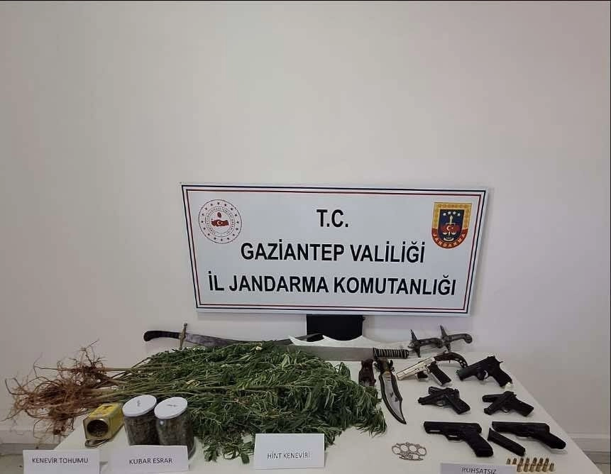 Gaziantep’te silah kaçakçılığı ve uyuşturucu ticareti suçlarına yönelik operasyonda 6 şüpheli şahıs gözaltına alındı. Yapılan aramalarda çok sayıda çeşitli suç unsuru ele geçirildi.Gaziantep İl Jandarma Komutanlığı ve Cumhuriyet Başsavcılığı koordinesinde silah kaçakçılığı ve uyuşturucu ile mücadeleye yönelik operasyon yapıldı. Araban, Şehitkamil ve Şahinbey ilçelerinde yapılan operasyonlar neticesinde ’Silah ve Mühimmat Kaçakçılığı ile Uyuşturucu Ticareti’ suçunu işleyen K.E., M.E., E.A., B.K., O.Ö. ve M.Ö. isimli (6) şüpheli şahıs yakalandı. Yakalanan şüphelilerden K.E., M.E., E.A., B.K., O.Ö. sevk edildiği adli makamlarca adli kontrol şartıyla serbest bırakılırken, M.Ö. tutuklanarak cezaevine teslim edildi.Şüphelilere ait 6 ayrı adreste eş zamanlı yapılan adli arama neticesinde ise 2.5 kilo kubar esrar, 30 kök kenevir bitkisi, 220 gram kenevir tohumu, 9 adet ruhsatsız tabanca, 4 adet av tüfeği, 99 adet tabanca fişeği, 13 adet av tüfeği fişeği, 8 adet kama, kılıç ve muşta, 1 adet motosiklet ve 1 adet hassas terazi ele geçirildi.
