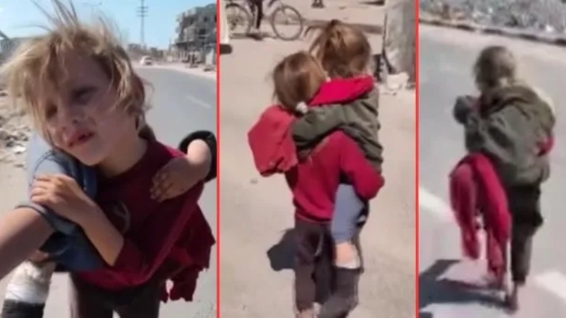 İsrail’in Gazze Şeridi’ne yönelik saldırıları devam ederken, bölgedeki insanlık krizi her geçen gün derinleşiyor. Gazze Şeridi’nde İsrail saldırıları nedeniyle yerinden edilmiş olan bir kız çocuğu, yaralanan kız kardeşini kilometrelerce omzunda taşıdı. Küçük kız, görüntülerde kardeşinin bir kazada bacağından yaralandığını belirterek, “Çok yorgunum. Bir saattir kucağımda taşıyorum ve artık yürüyemiyorum” ifadelerini kullandı.