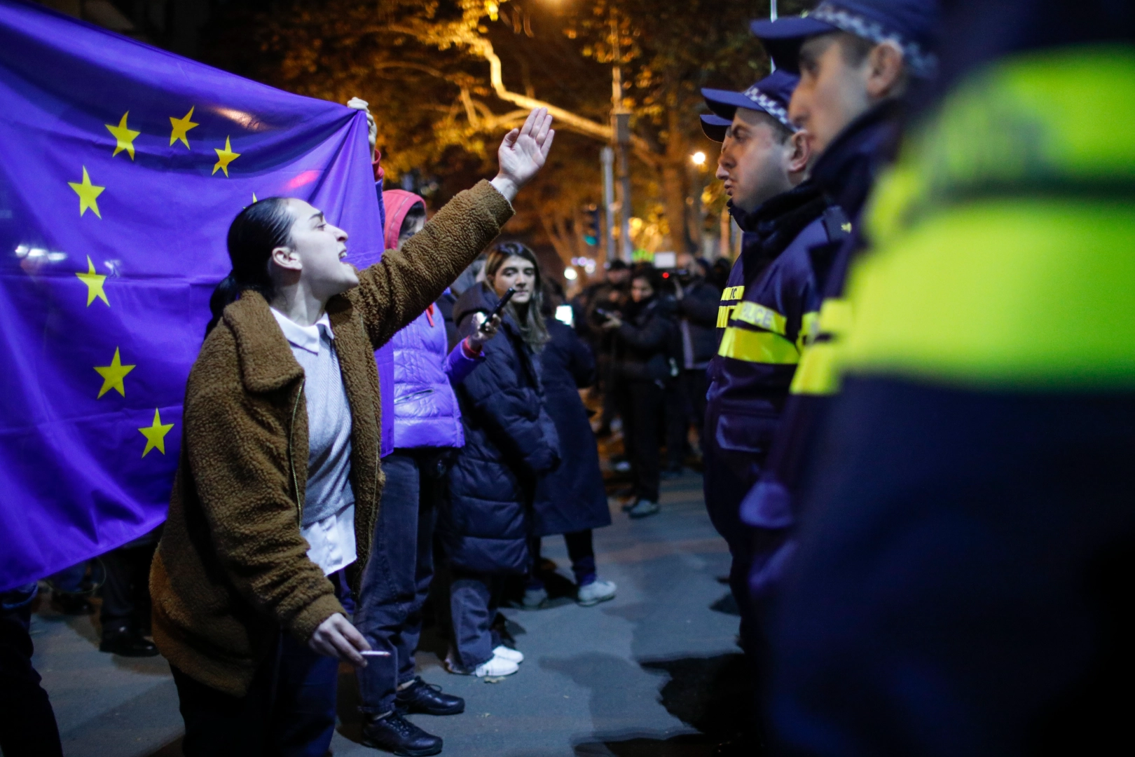 Gürcistan'da Başbakan İrakli Kobakhidze hükümetinin AB'ye katılım müzakerelerini 2028 yılına kadar gündeme getirmeyeceklerine yönelik kararı, halkı sokağa döktü. Başkent Tiflis'te AB ve Gürcistan bayrakları taşıyan binlerce protestocu parlamento binası önünde toplanarak, "Yaşasın Gürcistan", "Köleler", "Ruslar", "Git, git" şeklinde sloganlar attı. Polis protestoculara dağılmaları yönünde uyarıda bulundu. Protestocuların parlamentoya girmeye çalışması üzerine polis, tazyikli su ve göz yaşartıcı gaz kullandı. Bazı protestocular polise havai fişek attı. Çıkan olaylarda onlarca kişi yaralandı. Yerel saatle 21.00'de başlayan protesto, çatışmaya dönüşerek sabah saatlerine kadar devam etti. Gürcistan İçişleri Bakanlığından protestoya ilişkin açıklamada, 43 protestocunun gözaltına alındığı, 32 polisin yaralandığı bildirildi.