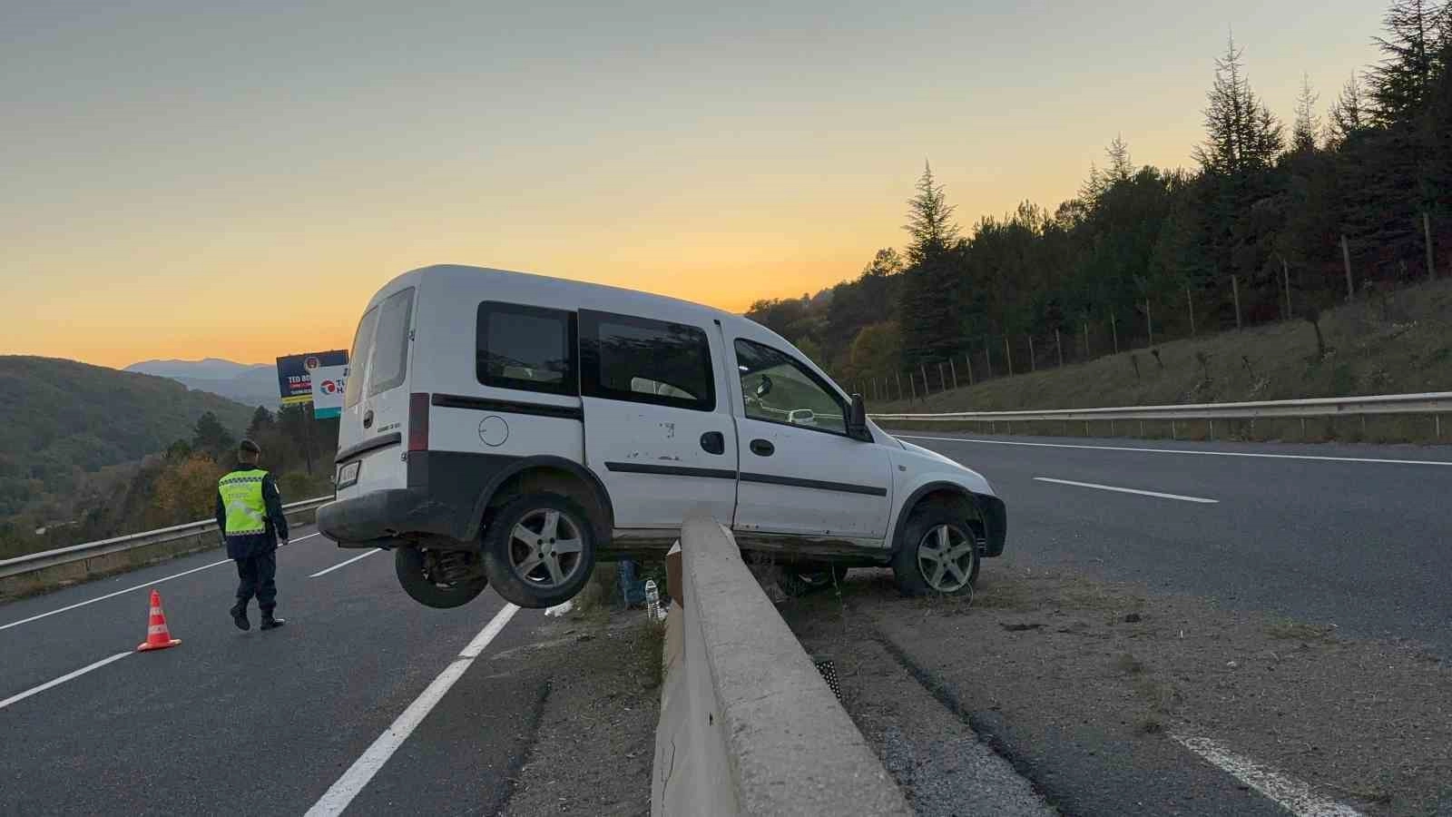 Bolu’da D-100 karayolunda kontrolden çıkan hafif ticari araç, beton bariyerde asılı kaldı. Kazada araçta bulunan 1 kişi yaralandı.Kaza, D-100 karayolu Yumrukaya mevkiinde meydana geldi. Edinilen bilgiye göre, Ankara istikametine seyreden Durmuş K. idaresindeki 14 AJ 060 plakalı hafif ticari araç, kontrolden çıkarak refüje çarpıp beton bariyerlerin üstüne çıktı. Beton bariyerlerde asılı kalan araçta bulunan Sibel K. hafif şekilde yaralandı. Olay yerinden geçen jandarma ekipleri tarafından yolda güvenlik önlemleri alınarak, durum 112 Acil Çağrı Merkezi’ne bildirildi. İhbar üzerine bölgeye sağlık ve polis ekipleri sevk edildi. Kaza yerine kısa sürede gelen sağlık ekipleri tarafından yaralı Sibel K. hastaneye kaldırıldı.Kazayla ilgili inceleme başlatıldı.