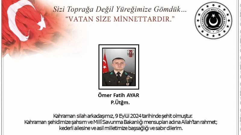 Milli Savunma Bakanlığından yapılan açıklamada, "Irak kuzeyinde Gara bölgesinde, 09 Eylül 2024 tarihinde, bölücü terör örgütü mensupları ile sağlanan temasta kahraman silah arkadaşımız P.Ütğm. Ömer Fatih Ayar ağır yaralanmış, derhal hastaneye sevk edilmiş, yapılan tüm müdahalelere rağmen kurtarılamayarak şehit olmuştur. Bizleri derin bir acı ve üzüntüye boğan bu olayda hayatını kaybeden aziz şehidimize Allah’tan rahmet, kederli ailesine, Türk Silahlı Kuvvetleri ile asil milletimize başsağlığı ve sabır dileriz" ifadelerini kullandı.