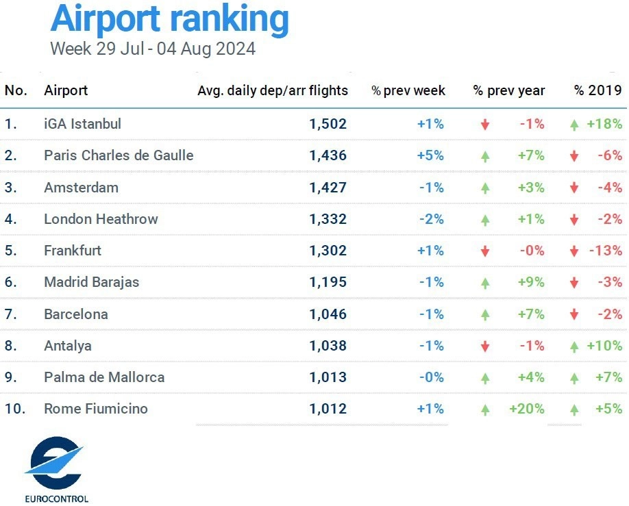 İstanbul Havalimanı, EUROCONTROL tarafından hazırlanan "29 Temmuz-4 Ağustos 2024" dönemi hava trafik istatistiklerine göre günlük ortalama bin 502 uçuşla Avrupa’nın en yoğun havalimanı oldu. İstanbul Havalimanı ayrıca, Olimpiyatlar’ın düzenlendiği Fransa’nın başkenti Paris’te bulunan Paris Charles de Gaulle Havalimanı’nı da geride bıraktı.Avrupa Hava Seyrüsefer Güvenliği Teşkilatı (EUROCONTROL) 29 Temmuz - 4 Ağustos 2024 tarihleri arasındaki Avrupa Havacılık Raporunu yayımlandı. Rapora göre İstanbul Havalimanı, bu dönemde günlük ortalama bin 502 uçuşla Avrupa’nın en yoğun havalimanları arasında ilk sırada yer aldı. İstanbul Havalimanı’nı sırasıyla, günlük ortalama bin 436 uçuşla Olimpiyatlar’ın düzenlendiği Fransa’nın başkenti Paris’te bulunan Paris Charles de Gaulle Havalimanı ve bin 427 uçuşla Amsterdam Schiphol Havalimanı izledi.