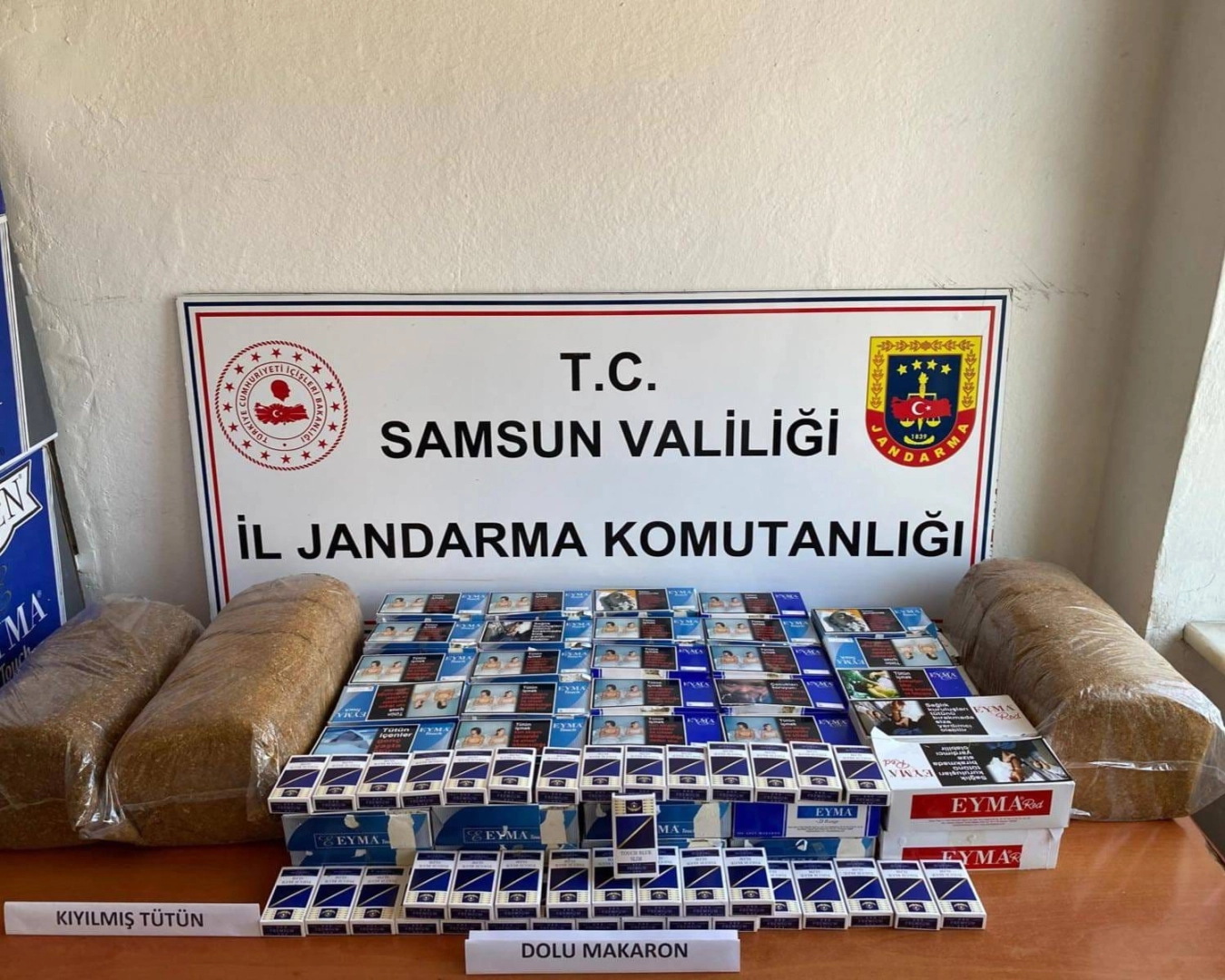 Samsun’da jandarma ekipleri tarafından yapılan operasyonda 12 bin 580 dal dolu makaron ve 15 kilo kıyılmış tütün ele geçirildi.Edinilen bilgiye göre, Terme ilçesinde jandarma ekipleri tarafından yapılan araştırmada K.K. isimli şahsın iş yerinde kaçak makaron olduğu bilgisine ulaşıldı. Samsun İl Jandarma Komutanlığı Kaçakçılık ve Organize Suçlularla Mücadele Şube Müdürlüğü ve Terme İlçe Jandarma Komutanlığı ekiplerince şahsın iş yerinde yapılan aramada 12 bin 580 dal içi tütün doldurulmuş makaron ve 15 kilo kıyılmış tütün ele geçirildi.Olayla ilgili soruşturma devam ediyor.