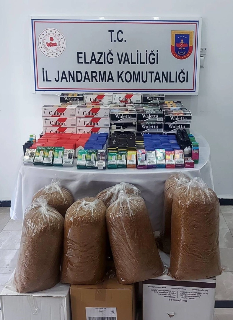 Elazığ’da jandarma ekipleri tarafından yapılan operasyonda piyasa değeri yaklaşık 1 milyon 200 bin lira değerinde kaçak sigara ve makaron ele geçirildi.Elazığ Cumhuriyet Başsavcılığı koordinesinde İl Jandarma Komutanlığı ekipleri tarafından M.Y. isimli şahsın işlettiği işyerinde adli arama yapıldı. Aramada piyasa değeri yaklaşık 1 milyon 200 bin T TL olan 33 bin 600 dal bandrolleri kesilmiş dolu sigara, 6 bin dal bandrolleri kesilmiş boş makaron, 23 adet elektronik nargile, 25 adet likit aroma, 2 adet likit esans, 17 adet nargile esansı ile 35 kilo kıyılmış sarmalık tütün ele geçirildi.Gözaltına alınan şüpheli hakkında adli tahkikata başlanıldığı bildirildi.