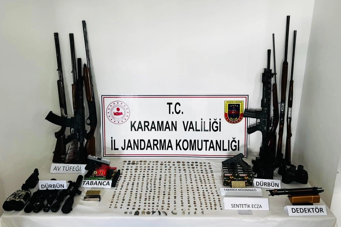 Karaman’ın Ayrancı ilçesinde jandarmanın düzenlediği operasyonda çok sayıda tarihi eser ile ruhsatsız silahlar ele geçirilirken, 1 kişi gözaltına alındı. Edinilen bilgiye göre, İl Jandarma Komutanlığı ekipleri, ilçeye bağlı köyde ismi açıklanmayan bir şahsın evinde ruhsatsız silah ve tarihi eser bulunduğu yönünde bilgiye ulaştı. Cumhuriyet Başsavcılığının koordinesinde harekete geçen ekipler, şahsın evine operasyon düzenledi. Yapılan aramalarda 8 adet ruhsatsız av tüfeği, 2 adet kurusıkı tabanca, bin 547 adet tabanca mermisi, 455 adet tarihi eser olduğu değerlendirilen obje, 1 adet dedektör, 11 adet kaçak avcılıkta kullanılan ses yayın cihazı, 5 adet silah üstü dürbün, 2 adet gece görüş dürbünü ile 3 adet el dürbünü ele geçirdi. Gözaltına alına şahıs, hakkında adli işlem başlatılmak üzere karakola götürülürken, aynı zamanda 76 bin 202 lirada idari para cezası yazıldı.