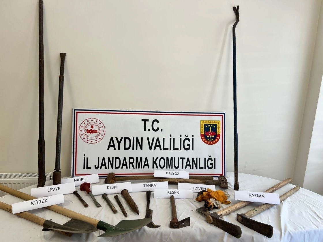 Aydın’ın Koçarlı ilçesinde kaçak kazı yapan 4 şüpheli jandarma ekiplerince suçüstü yakalandı.Koçarlı İlçe Jandarma Komutanlığınca tarihi eser kaçakçılığına yönelik gerçekleştirilen çalışmalar aralıksız sürüyor. Edinilen bilgiye göre Koçarlı ilçesi Yeniköy Mahallesi’nde icra edilen devriye esnasında E.K., M.Ö., M.B. ve A.Ç. isimli 4 şüpheli şahıs tarihi eser bulmak amacıyla izinsiz kazı yaptıkları esnada suçüstü yakalandı. Ayrıca şüpheliler ile birlikte kazı malzemeleri de ele geçirildi. Yakalanarak gözaltına alınan şüpheli şahıslar hakkında başlatılan adli süreç devam ediyor.