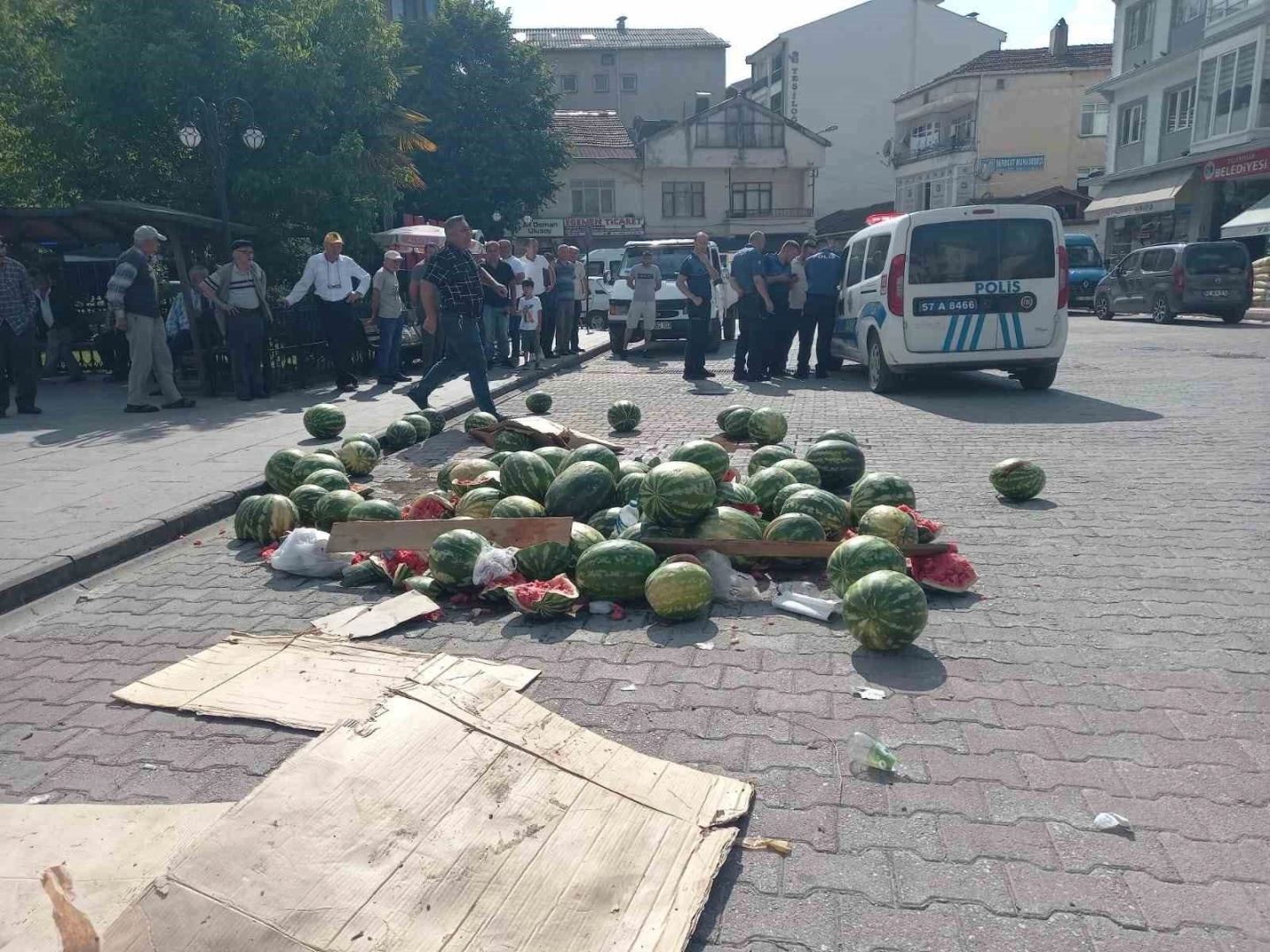 Sinop’un Erfelek ilçesinde kendisine karpuz satışı için izin verilmediği belirtilen vatandaş karpuzları parçalayarak kaymakamlık binası önüne döktü.Sinop’un Erfelek ilçesinde karpuz satışı yapmak için belediyeden izin almak isteyen vatandaş belediyenin kendisine yer göstermemesine sinirlenerek satmak için getirdiği karpuzları Erfelek Kaymakamlığı önünde parçalayarak yere döktü. Sinirli vatandaş olay yerinden uzaklaşırken yere dökülen karpuzlar Erfelek Belediyesine ait kepçe ile olay yerinden kaldırıldı.Polis olayla ilgili inceleme başlattı.