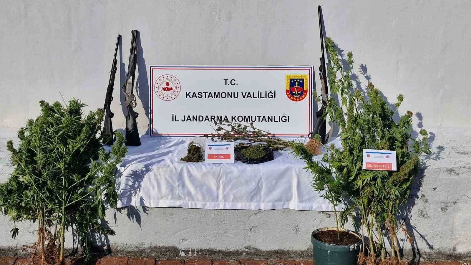 Kastamonu’da jandarma ekipleri tarafından düzenlenen uyuşturucu operasyonlarında 6 kişi gözaltına alındı.Edinilen bilgiye göre, Kastamonu İl Jandarma Komutanlığı ekiplerince uyuşturucu madde imal ve ticareti yapan şahıslara yönelik yürütülen çalışmalar çerçevesinde, Cide ilçesinde A.T., H.K., H.K., Y.K. ve M.G. isimli şahıslara ait ev ve eklentilerinde arama yapıldı. Yapılan aramada bin 60 gram skunk maddesi, 43 kök skunk bitkisi ve 3 adet ruhsatsız av tüfeği ele geçirildi. Operasyonlarda yakalanan 5 şahıs gözaltına alındı. Taşköprü ilçesinde de T.B. isimli şahsın ikamet ve tarlasında yapılan aramada 10 kök kenevir bitkisi, 1 adet ruhsatsız av tüfeği ele geçirildi. Jandarma ekiplerince T.B. isimli şahıs gözaltına alındı.