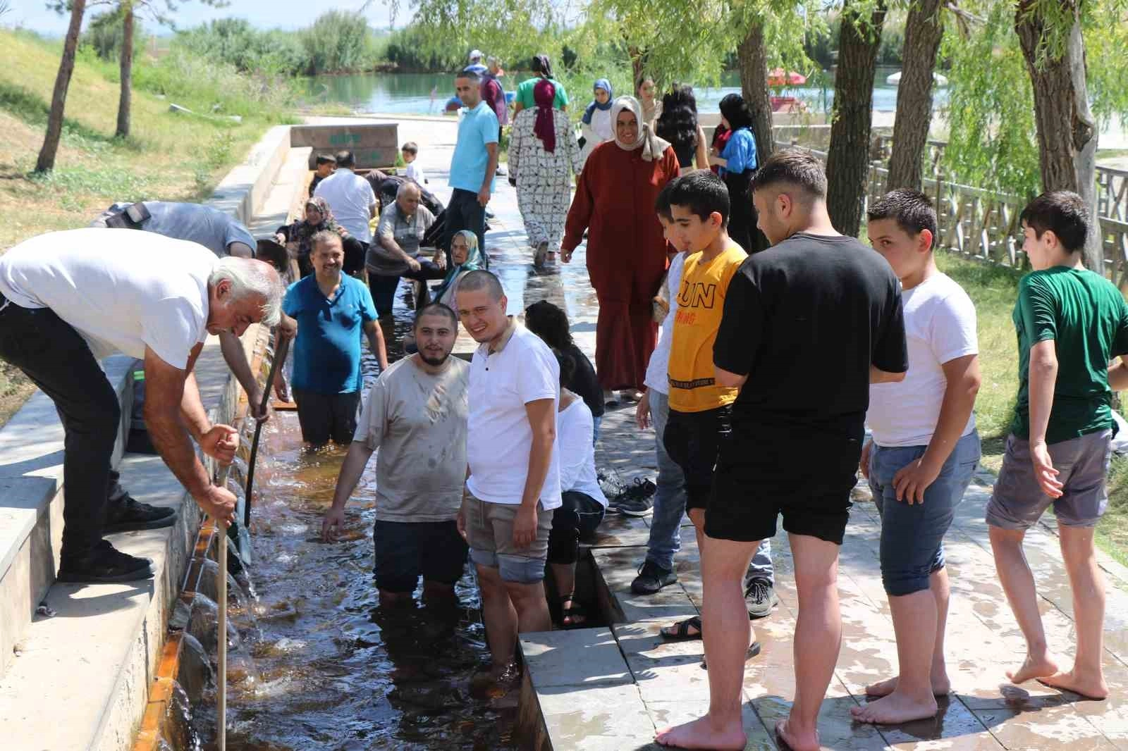 Erzincan’ın bunaltıcı sıcaklarında yeşilin en güzel tonuna ev sahipliği yapan Ekşisu mesire alanı, serin suyuyla vatandaşların vazgeçilmezi oldu.Erzincan Ekşisu mesire alanı kükürtlü suyu ve büyüleyen doğasıyla özellikle yaz aylarında yerli ve yabancı turistlerle dolup taşıyor. Bunaltıcı sıcaklardan kaçmak isteyenler Ekşisu’yun serin sularında ferahlıyor. Erzincan’da hava sıcaklıklarının mevsim normallerinin üzerinde seyretmesiyle birlikte sıcaktan bunalan vatandaşlar Ekşisu’ya gelerek aileleri ile birlikte buz gibi suyun ve serin havanın keyfini çıkarıyor.İstanbul’dan Erzincan’a geldiğini belirten bir vatandaş ayağında mantar olduğunu ve şifayı Erzincan’ın Ekşisu’yunda aradığını aktardı.Bir başka gurbetçi ise Erzincan’a gelmek için çok yol kat ettiklerini ifade ederek, “Su kükürtlüymüş. Egzama için geldim buraya. Bu su çok şifalı. Türkiye’mizin 7 cennetinin en güzel yerlerinden biri Erzincan. Bizler de şifa bulmaya geldik. Şifa bulmak isteyen herkesi Erzincan’a bekleriz. Sıcak havalarda serinlemek için çok ideal bir yer” dedi.Vatandaşlar kavurucu sıcakta Ekşisu’yun buz gibi suyuna kendilerini bırakırken suyun tadını yine en çok çocuklar çıkarttı.