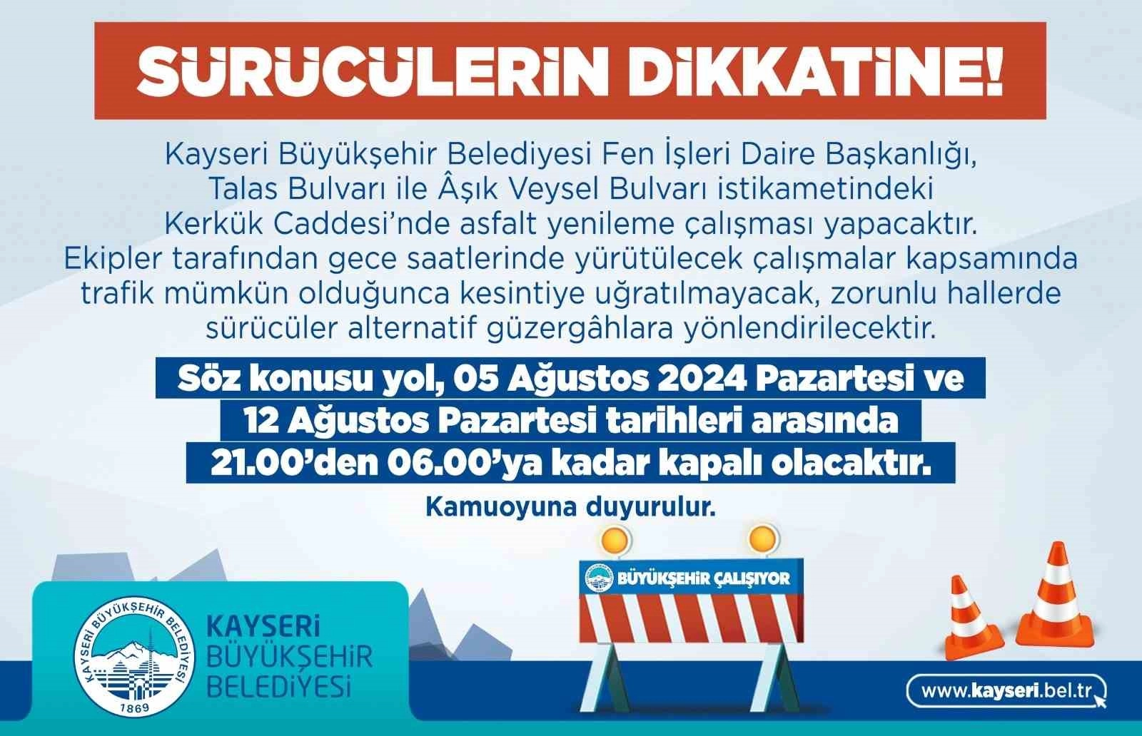 Kayseri Büyükşehir Belediyesi, Talas Bulvarı ile Âşık Veysel Bulvarı istikametindeki Kerkük Caddesi’nde asfalt yenileme çalışması yapacak. Ekipler tarafından gece saatlerinde yürütülecek çalışmalar kapsamında, araç sürücüleri alternatif güzergâhlar için uyarıldı.Büyükşehir belediyesinden yapılan yazılı açıklamada; yol çalışmaları çerçevesinde araç sürücülerine uyarılarda bulunuldu. Açıklamada, “Büyükşehir Belediyemizce Talas Bulvarı ile Âşık Veysel Bulvarı istikametindeki Kerkük Caddesi’nde asfalt yenileme çalışması yapılacaktır. Çalışmalar sırasında trafik mümkün olduğunca kesintiye uğratılmayacak, zorunlu hallerde sürücüler alternatif güzergâhlara yönlendirilecektir. Bu güzergâhı kullanan sürücülerin çalışma yapılacak gün ve saatlerde alternatif güzergâhları tercih etmeleri tavsiye edilmektedir" denildi.Çalışmanın yaklaşık 1 hafta sürmesi planlandığı belirtilen açıklamada, "Söz konusu yol, 5 Ağustos 2024 Pazartesi ve 12 Ağustos 2024 Pazartesi günleri arasında 21.00’de kapanacak, 06.00’da açılacak” ifadeleri kullanıldı.