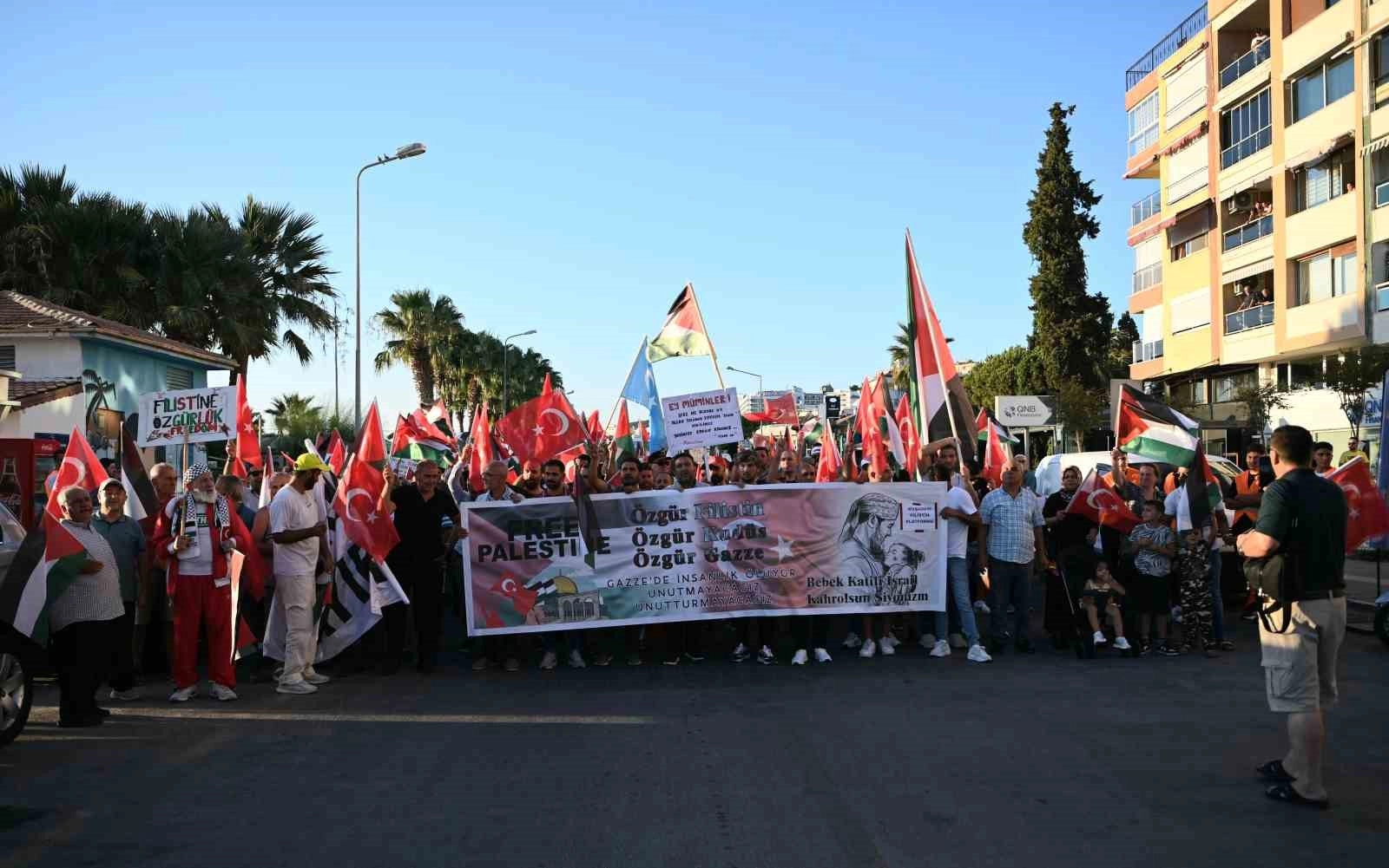 Aydın’ın Kuşadası ilçesinde, İsrail’in Gazze’ye yönelik yaptığı saldırıların 300 gündür devam etmesi nedeniyle sivil toplum kuruluşları tarafından protesto yürüyüşü düzenlendi.Kuşadası Filistin Platformu öncülüğünde gerçekleştirilen yürüyüşte, Kısmet Otel Kavşağı’nda toplanan kalabalık, sahil bandı üzerinden İsmail Cem Dostluk ve Barış Meydanı’na kadar yürüdü. Ellerinde Türk ve Filistin bayrakları taşıyanlar, ‘Nehirden denize özgür Filistin’, ’Katil İsrail, işbirlikçi Amerika’, ’Filistin halkı yalnız değildir’ sloganları attı. Korteje katılanlar, üzerinde ’Gazze katliamının 300. günü’, ’Kahrolsun İsrail’, ’Özgür Filistin’ yazılı pankart ve dövizler taşıdı. Protesto yürüyüşü, meydanda yapılan basın açıklamasının ardından sona erdi.
