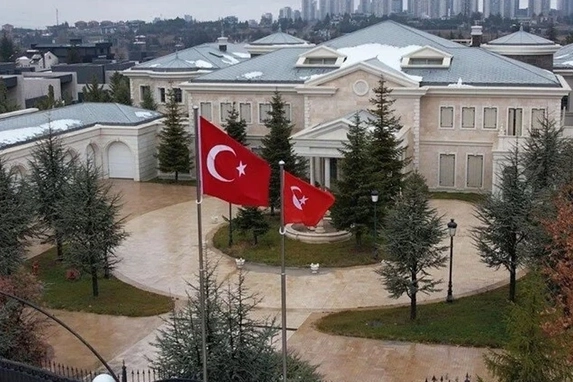 14 bin 182 metrekare açık, 7 bin 379 metrekare kapalı alana sahip 4 katlı Varlık Fonu'na geçen Lüks malikanenin girişine büyük boyutlarda iki Türk bayrağı asıldı.