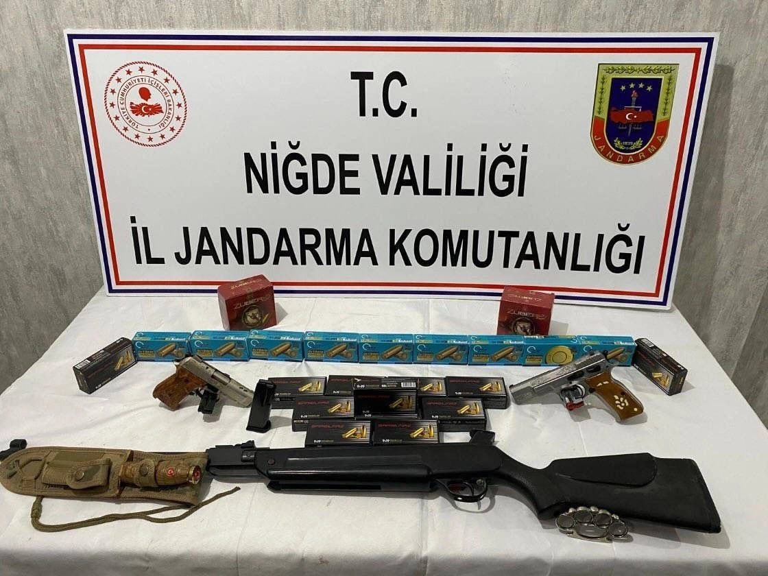 Niğde’de balkondan havaya ateş açıp görüntüleri sosyal medyada paylaşan 3 kişi gözaltına alındıNiğde İl Jandarma Komutanlığı Siber Suçlarla Mücadele Şube Müdürlüğü ekipleri, Niğde’nin Bor ilçesine bağlı Çukurkuyu Beldesinde ikamet eden O.Ö, C.S.Ö ve V.Ö isimli şahısların meskun mahal içinde bulunan bir evin balkonundan hayaya ateş ettiğini ve bu görüntüleri sosyal medya platformunda paylaştıklarını tespit etti. Jandarma ekipleri şahıslar hakkında genel güvenliği kasten tehlikeye sokma suçu kapsamında işlem başlattı. Şahısların adreslerinde yapılan aramada, 1 adet tabanca, 1 adet kuru sıkı tabanca, 1 adet havalı tüfek, bin 80 adet tabanca fişeği, 50 adet av tüfeği fişeği, 1 adet kasatura ve 1 adet muşta ele geçirildi.Şahıslar hakkında işlem başlatıldı.