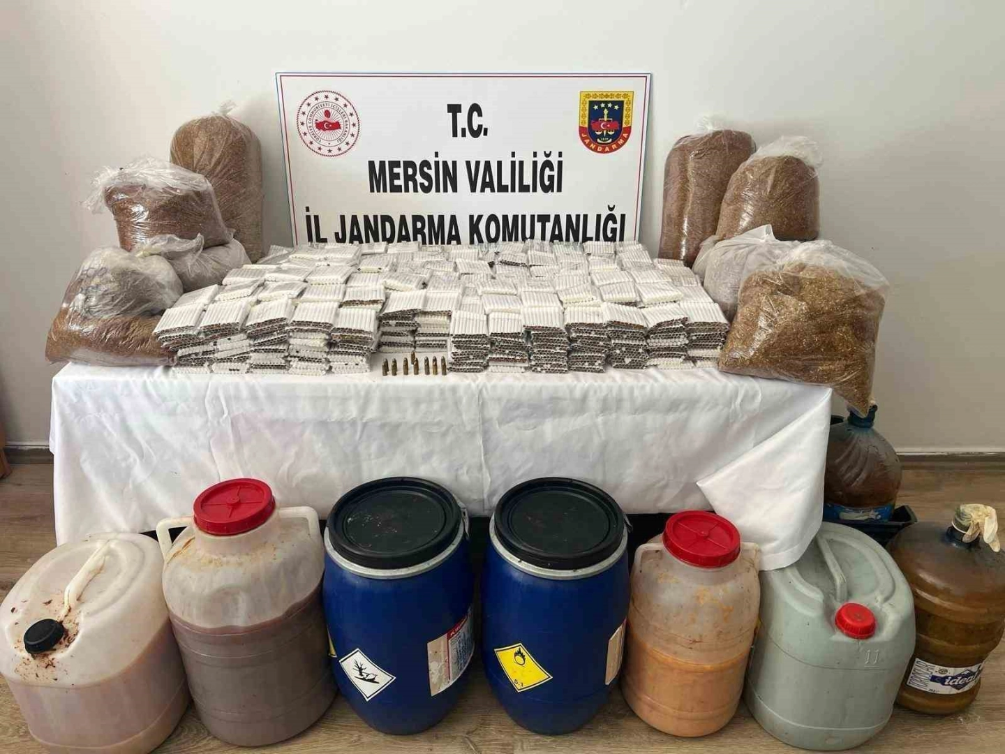 Mersin’de jandarma ekiplerinin düzenlediği operasyonda çok miktarda kaçak makaron, tütün ve sahte içki ele geçirildi.Alınan bilgiye göre, İl Jandarma Komutanlığı ekipleri Mezitli ilçesinde bir şahsın elinde bulunan kaçak makaronları piyasaya süreceği bilgisini alarak harekete geçti. Belirlenen şahsa yönelik operasyon düzenleyen ekipler şüpheliyi yakalayarak gözaltına aldı. Yapılan arama da ise kaçak 27 bin 250 adet dolu makaron, 29 kilo 700 gram kıyılmış tütün, 215 litre sahte içki ve 1 adet ruhsatsız tabanca ele geçirildi.Yakalanan şüpheli jandarmaya götürüldü.