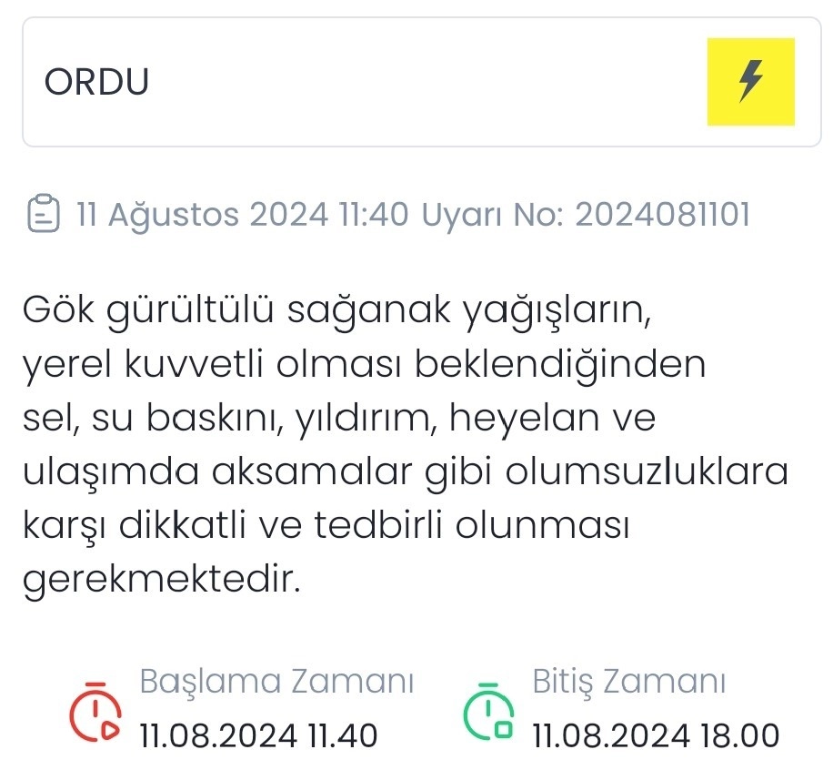 Meteoroloji Genel Müdürlüğünden yapılan sarı uyarıda, Ordu’da kuvvetli yağış beklendiği bildirildi.Meteoroloji Genel Müdürlüğünden yapılan uyarıda, 11 Ağustos öğlen saatlerinden itibaren etkili olacak yağışların, aynı günün akşam saatlerine kadar etkili olacağı bildirildi. Aşırı yağışlara karşı dikkatli olunması gerektiğine dikkat çekilen uyarıda, “Gök gürültülü sağanak yağışların, yerel kuvvetli olması beklendiğinden sel, su baskını, yıldırım, heyelan ve ulaşımda aksamalar gibi olumsuzluklara karşı dikkatli ve tedbirli olunması gerekmektedir" denildi.