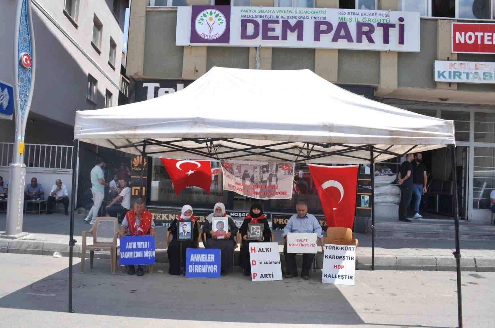 Muş’ta çocukları terör örgütü PKK tarafından kaçırılan aileler, DEM Parti il binası önündeki oturma eylemine devam ediyor. Çocuklarının geri dönmesi için kararlılıkla nöbetlerini sürdüren aileler, kamuoyundan destek bekliyor.Muş’ta çocuklarını terör örgütü PKK’nın pençesinden kurtarmak isteyen ailelerin DEM Parti il binası önündeki eylemi devam ediyor. Aileler, çocuklarının en kısa sürede güvenli bir şekilde evlerine dönmesini beklerken, toplumun da bu konuda destek olmasını istiyor. Çocuklarına kavuşma ümidiyle her hafta çarşamba günü DEM Parti il binası önünde bir araya gelen aileler, "Anneler direniyor" ve "Yeter artık evlatlarımızı bırakın" pankartları açtı. Anne ve babalar, yıllardır hasretle bekledikleri çocuklarına teslim olmaları için çağrıda bulundu.Anne Ayten Koçhan, yaklaşık 8 yıldır çocuğunun Bursa’dan kaçırıldığını söyledi. DEM Parti ve PKK’dan çocuğunu isteyen Koçhan, "3 yıldır eylemimize devam ediyoruz ve devam edeceğiz. Ben PKK’dan, HDP’den çocuğumu istiyorum. Yılanın başı HDP’dir. Çocuklarımız versinler. Biz evlat hasretine dayanamıyoruz. Biz evladımızın peşindeyiz. Ersin, beni duyuyorsan gel teslim ol. Yolunuz yol değil. Bu Türk-Kürt davası değil. Bunlar Amerika’nın planıdır. Gelin devletinize teslim olun. Senin hasretine artık dayanamıyoruz” diye konuştu.Anne Şahinaz Özcan oğlunu DEM Parti ve PKK’dan istediğini belirterek, “Dağda bir kişi kalana kadar eylemime devam edeceğim. Oğlum eğer sesimi duyuyorsan gel devlete teslim ol" dedi.