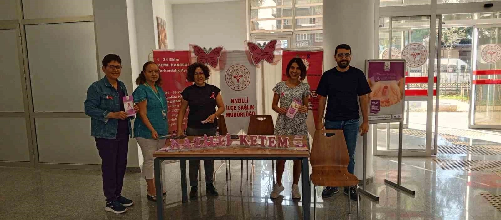 Aydın’ın Nazilli ilçesinde Nazilli Devlet Hastanesi’nde 1-31 Ekim Meme Kanseri Farkındalık Ayı etkinlikleri kapsamında stant çalışması yapılarak bilgilendirmelerde bulunuldu.1 - 31 Ekim Meme Kanseri Farkındalık Ayı dolayısıyla Nazilli Devlet Hastanesi’nde stant çalışması yapıldı. Sağlık alanında toplumsal bilinçlenmeyi artırmayı ve insanların kendi sağlıklarına daha fazla özen göstermelerinin sağlanmasının amaçlandığı etkinlikte standı ziyaret eden vatandaşlara ve Nazilli KETEM’e kanser taraması için gelen kadınlara ’meme kanseri’ hakkında bilgilendirmede bulunularak broşür dağıtıldı. Ayrıca Nazilli Kanser Erken Tanı Merkezi’nde görevli hekim Uzm. Dr. Banu Çiçek Denir tarafından Nazilli SODAM kursiyerlerine de ’Meme Kanseri ve KKMM’ hakkında eğitim verildi.