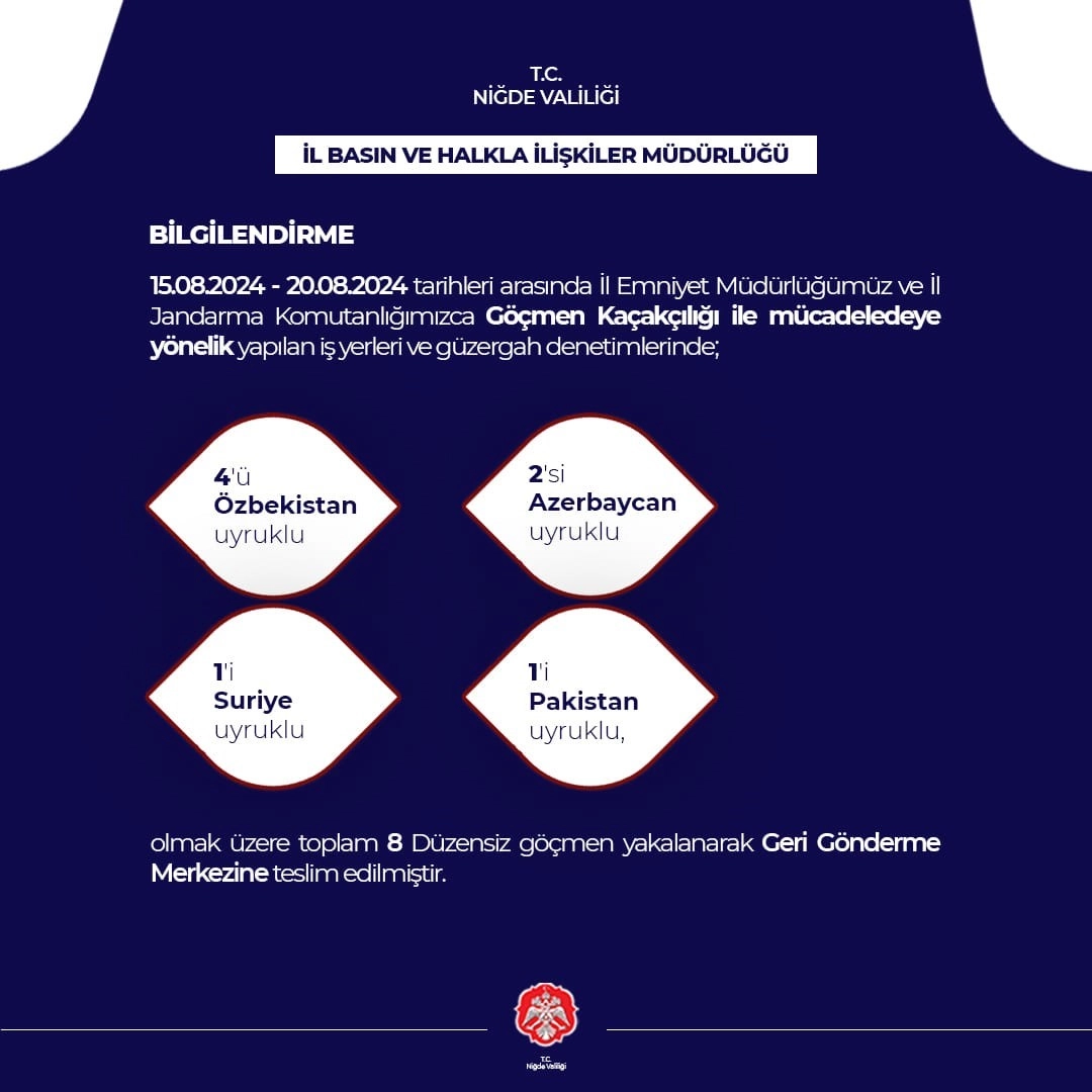 Niğde’de göçmen kaçakçılığı ile mücadeleye yönelik çalışmalar kapsamında 8 düzensiz göçmen yakalandı.Niğde Valiliği’nden yapılan açıklamada 15-20 Ağustos tarihleri arasında İl Emniyet Müdürlüğü ile İl Jandarma Komutanlığı ekiplerince yürütülen göçmen kaçakçılığı ile mücadeleye yönelik çalışmalar kapsamında 4’ü Özbekistan, 2’si Azebaycan, 1’i Suriye ve 1’i Pakistan uyruklu olmak üzere 8 düzensiz göçmenin yakalandığı bildirildi.Yakalanan düzensiz göçmenler Niğde’de bulunan Geri Gönderme Merkezi’ne teslim edildi.