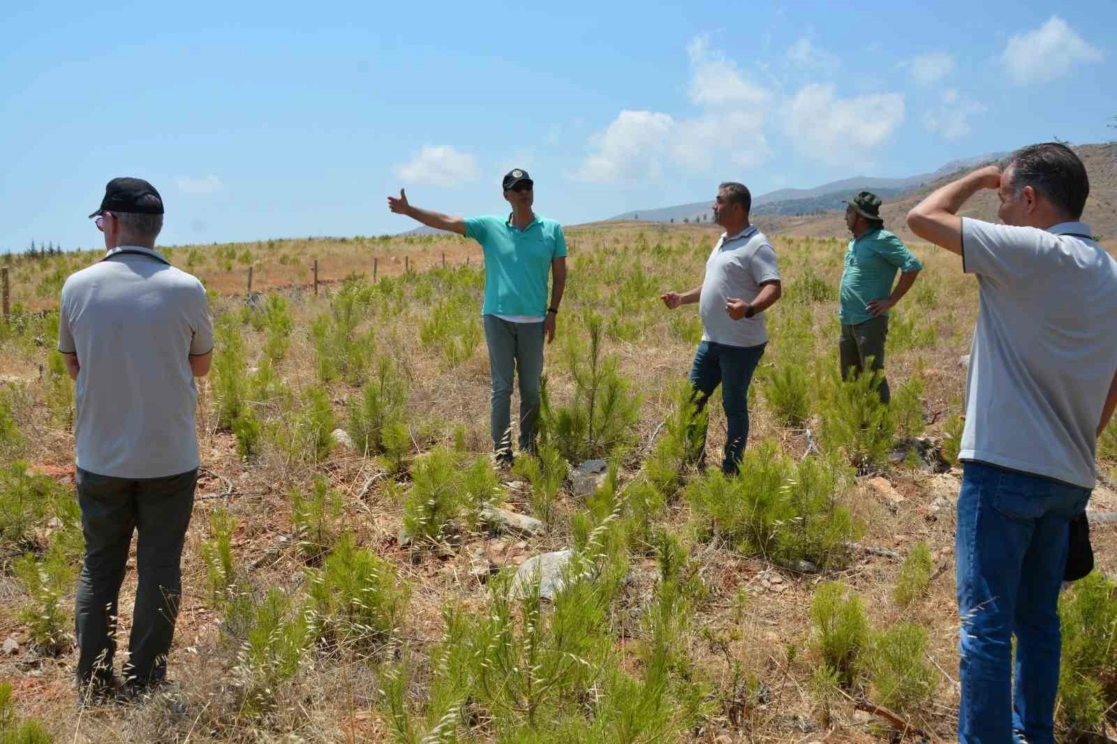 Mersin Silifke ilçesinde orman yangınlarında yanan sahalara ’İklime Dirençli Ormancılık Projesi’ çerçevesinde dikilen fidanlar büyüyor.Orman Genel Müdürlüğü Silvikültür Daire Başkanlığı Şube Müdürleri İsmail Hakkı Barı ve Cengiz Metin, Silifke Orman İşletme Müdürlüğü Yeşilovacık Orman İşletme Şefliğinde tesis edilen sahalarda İklime Dirençli Ormancılık Projesi (İDOP) kapsamında yapılan çalışmaları incelendi. Silifke Orman İşletme Müdürü Harun Boz, işletme şefleri ve orman muhafaza memurlarının katılımıyla, Yeşilovacık Orman İşletme Şefliği sahasında 2021 ve 2022 yıllarında yanan sahalarda yapılan çalışmalar değerlendirilerek, yangına dirençli türlerden olan servi, harnup, akasya ve defne fidanlarının kontrolü yapıldı.Heyettekiler, saha kontrollerinin ardından tesis yollarına yapılan 6 ila 15 metre genişliğinde ve 20 ila 30 metre aralığındaki yangın durdurma zonunda incelemelerde bulundu.