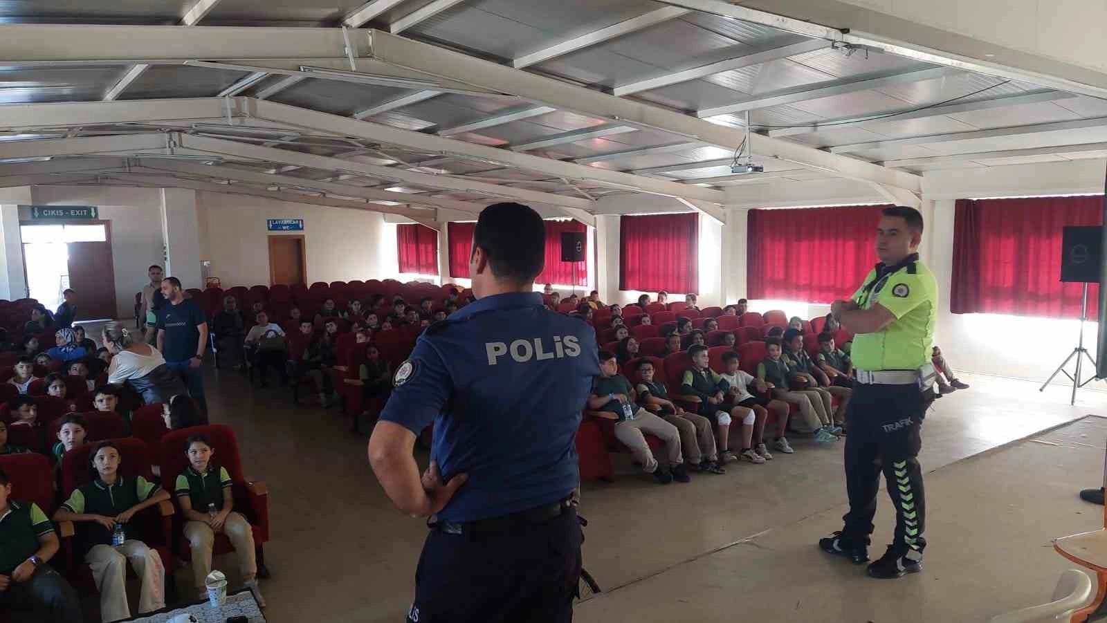 Karacasu Şehitleri Ortaokulu’nda, İlçe Emniyet Amirliği personelleri tarafından öğrencilere yönelik kapsamlı bir eğitim semineri düzenlendi.Aydın’ın Karacasu ilçesinde öğrencilerin güvenli bir yaşam sürmeleri ve çevrelerindeki tehlikelerden korunmaları amacıyla ortaokul öğrencilerine yönelik eğitim semineri düzenlendi. Seminere katılan öğrenciler, meslek tanıtımının yanı sıra kişisel güvenlik, suçtan korunma yöntemleri, güvenli internet kullanımı ve güvenli trafik eğitimi gibi konularda bilgilendirildi. Emniyet yetkilileri genç bireylerin bilinçlenmesinin önemine vurgu yaparak bu tür seminerlerin düzenli olarak devam edeceğini belirtti.