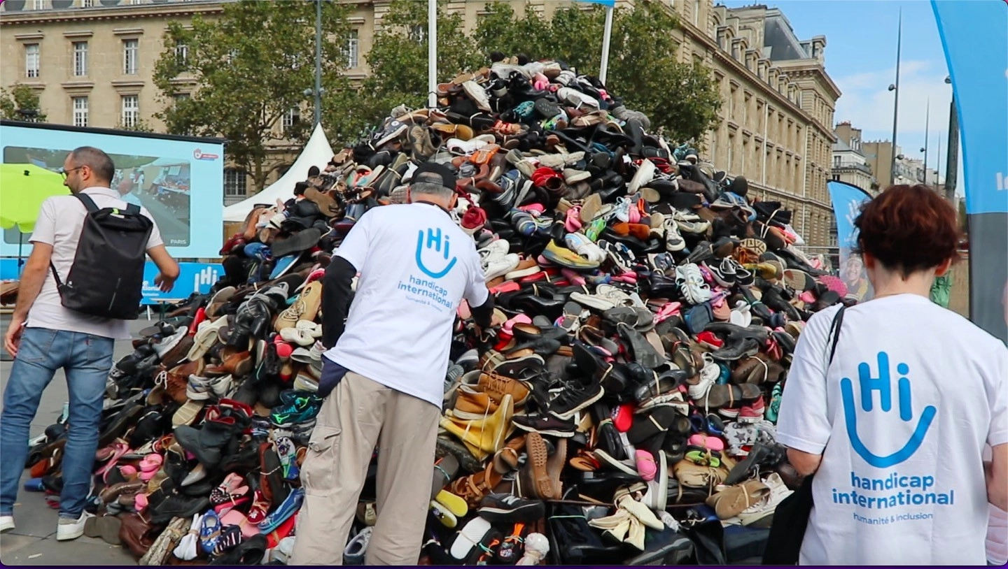 Fransa’nın başkenti Paris’te uluslararası sivil toplum kuruluşu Handicap International tarafından mayın ve bombalar nedeniyle uzuvlarını kaybedenlere destek gösterisi düzenlendi. Gösteride, İsrail’in saldırıları nedeniyle geçen sene uzuvlarını kaybederek sakat kalan sivillerin sayısının yüzde 130 arttığı belirtildi.Uluslararası sivil toplum kuruluşu Handicap International, Fransa’nın başkenti Paris’te mayın ve bombalar nedeniyle uzuvlarını kaybedenlere destek gösterisi düzenledi. Handicap International, İsrail’in saldırıları nedeniyle geçen sene uzuvlarını kaybederek sakat kalan sivillerin sayısının yüzde 130 arttığını belirtti. Republique Meydanı’nda 30’uncusu düzenlenen gösteride katılımcılar, her bir ayakkabının mayın ve bombalar nedeniyle ölen ya da yaralanan sivilleri temsil ettiği ayakkabılardan oluşan bir piramit yaptı. Mayın ve bombalar nedeniyle sakat kalan çocukların ve yetişkinlerin heykelleri ile saldırılar sonucu yıkılan binaların enkaz parçalarının sergilendiği eylemde, yerinden edilen aileleri temsilen çadırlar kuruldu.