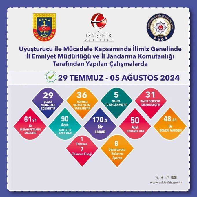Eskişehir’de polis ve jandarma ekiplerince son 1 haftada gerçekleştirilen 29 farklı uyuşturucu operasyonunda yakalanan 36 kişiden 5’i tutuklanırken, çok miktarda narkotik madde ele geçirildi.Edinilen bilgilere göre, İl Emniyet Müdürlüğü’ne ve İl Jandarma Komutanlığı’na bağlı ekipler tarafından 29 Temmuz ile 5 Ağustos tarihleri arasında 29 farklı uyuşturucu operasyonu gerçekleştirildi. Operasyonlar neticesinde gözaltına alınan 36 şüpheliden 5’i çıkarıldıkları mahkemece tutuklanarak cezaevine gönderildi. Düzenlenen operasyonlar yapılan aramalarda, 61,21 gram metamfetamin, 90 adet sentetik ecza hapı, 170,3 gram esrar, 50 adet uyuşturucu hap, 48,41 gram bonzai, 6 adet uyuşturucu kullanma aparatı, 1 adet tabanca ve 7 adet fişek ele geçirildi.