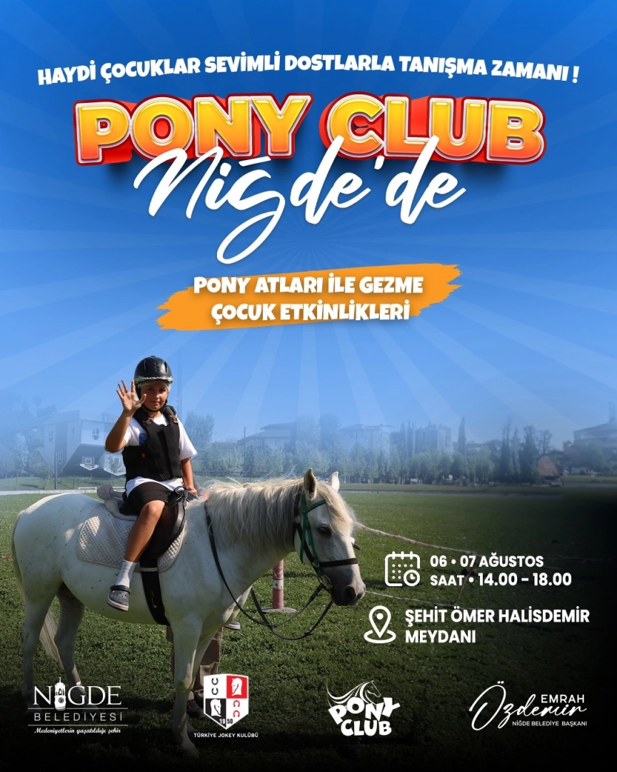 Niğde Belediyesi, çocuklara at sevgisini aşılamak amacıyla Türkiye Jokey Kulübü (TJK) ile birlikte 6-7 Ağustos tarihlerinde “Pony Club” etkinliği düzenleyecek.4-14 yaş arasındaki çocuklar, Niğde Ömer Halisdemir Meydanı’nda gerçekleştirilecek etkinliğe ücretsiz katılabilecek. TJK’nın 2014 yılından bu yana, Türkiye’nin pek çok noktasında, çocukları pony atlarla buluşturduğu “Pony Club Şehrimize Geliyor” etkinliğinin yeni adresi Niğde olacak. Niğde Belediyesi’nin ev sahipliğinde, Niğde Ömer Halisdemir Meydanı’nda başlayacak etkinlik 2 gün sürecek. 4-14 yaş arasındaki çocuklar, 14.00- 18.00 saatleri arasında profesyonel bir ekibin gözetiminde pony atlara binebilecek. Niğde Belediyesi, çocukların ücretsiz olarak ata binme deneyimini yaşayacağı etkinlikte, katılımcılara çeşitli ikramlarda bulunacak, çocuklar için farklı aktiviteler de düzenlenecek.Niğde Belediye Başkanı Emrah Özdemir, çocuklara hayvan sevgisini aşılamak, onların belki de ilk kez ata binme deneyimlerini yaşayabilmelerine imkan sağlamak amacıyla gerçekleştirecekleri “Pony Club Şehrimize Geliyor” etkinliğine, tüm çocukları aileleriyle birlikte davet etti.