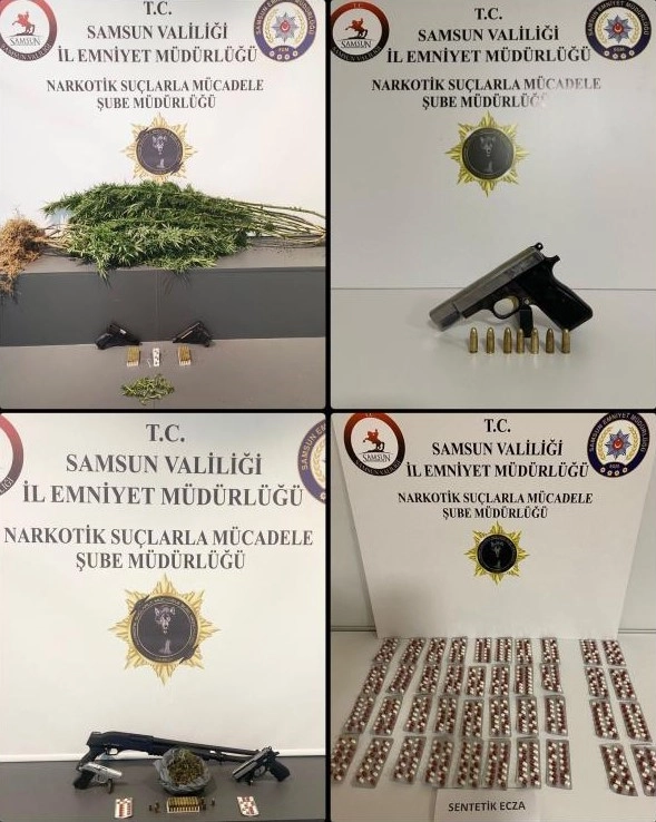 Samsun’da narkotik polisi tarafından düzenlenen uyuşturucu operasyonunda 10 kişi gözaltına alındı.Edinilen bilgiye göre, Samsun Emniyet Müdürlüğü Narkotik Suçlarla Mücadele Şube Müdürlüğü ekipleri, İlkadım ve Atakum ilçelerinin farklı mahallelerinde operasyon düzenlendi. Operasyonda şüpheli 10 şahsın üzerlerinde, araçlarında ve ikametlerinde yapılan aramalarda, 471 adet sentetik ecza, 18,77 gram metamfetamin, 57,50 gram esrar, 14 kök kenevir bitkisi, 4 adet uyuşturucu kullanım aparatı, 2 adet ruhsatsız tabanca, 3 adet kurusıkı tabanca, 2 adet ruhsatsız pompalı tüfek ve 167 adet tabanca fişeği ele geçirilmiştir. Olayla ilgili 10 kişi gözaltına alındı. Soruşturma devam ediyor.