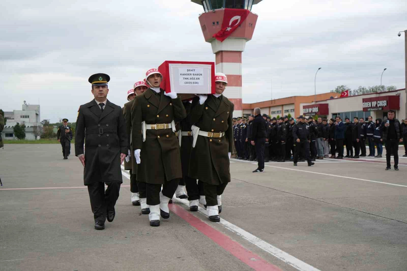 Pençe-Kaplan Operasyonu bölgesinde kalp krizi geçirerek şehit olan Samsunlu Tank Sözleşmeli Er Kander Babür’ün naaşı askeri uçakla memleketi Samsun’a getirildi. Şehit Babür, 2 yıl önce kalp krizinden ölen babası ile aynı kaderi paylaştı.Pençe-Kaplan Operasyonu bölgesinde nöbet sırasında kalp krizi geçiren Samsunlu Tank Sözleşmeli Er Kander Babür, helikopterle Şehit Tümgeneral Aydoğan Aydın Devlet Hastanesi’ne kaldırıldı. Burada yapılan yaklaşık 45 dakikalık kalp mesajına cevap vermeyen Tank Sözleşmeli Er Kander Babür, şehit oldu.Şehit Kander Babür’ün cenazesi askeri uçakla Samsun-Çarşamba Havalimanı’na getirildi. Burada şehidin naaşı törenle karşılandı. Şehidin annesi Meryem Babür, ağabeyi Ertuğrul Babür, ablası Ergül Doğan, yakınları ve sevdikleri gözyaşı döktü. Şehidin babasının Mehmet Babür’ün de 2 yıl önce kalp krizi sonucu vefat ettiği öğrenildi.Şehidi karşılama törenine Samsun Valisi Orhan Tavlı, AK Parti Samsun Milletvekili Orhan Kırcalı, Samsun Garnizon Komutanı Gazi Tümgeneral Davut Alâ, Samsun Büyükşehir Belediye Başkanı Halit Doğan, Sahil Güvenlik Karadeniz Bölge Komutanı Tuğamiral Ahmet Bahadır, İl Jandarma Komutanı Tuğgeneral Mustafa Bakçepınar, Samsun İl Emniyet Müdürü Ahmet Arıbaş, Terme Belediye Başkanı Şenol Kul, kolluk kuvvetleri, askeri erkan, kamu kurum ve kuruluşlarının temsilcileri katıldı.Bekar olduğu öğrenilen Şehit Babür’ün naaşı, ikindi namazını müteakip Terme ilçesi Pazar Camisi’nde kılınacak cenaze namazı sonrası Terme Şehitliği’ne defnedilecek.
