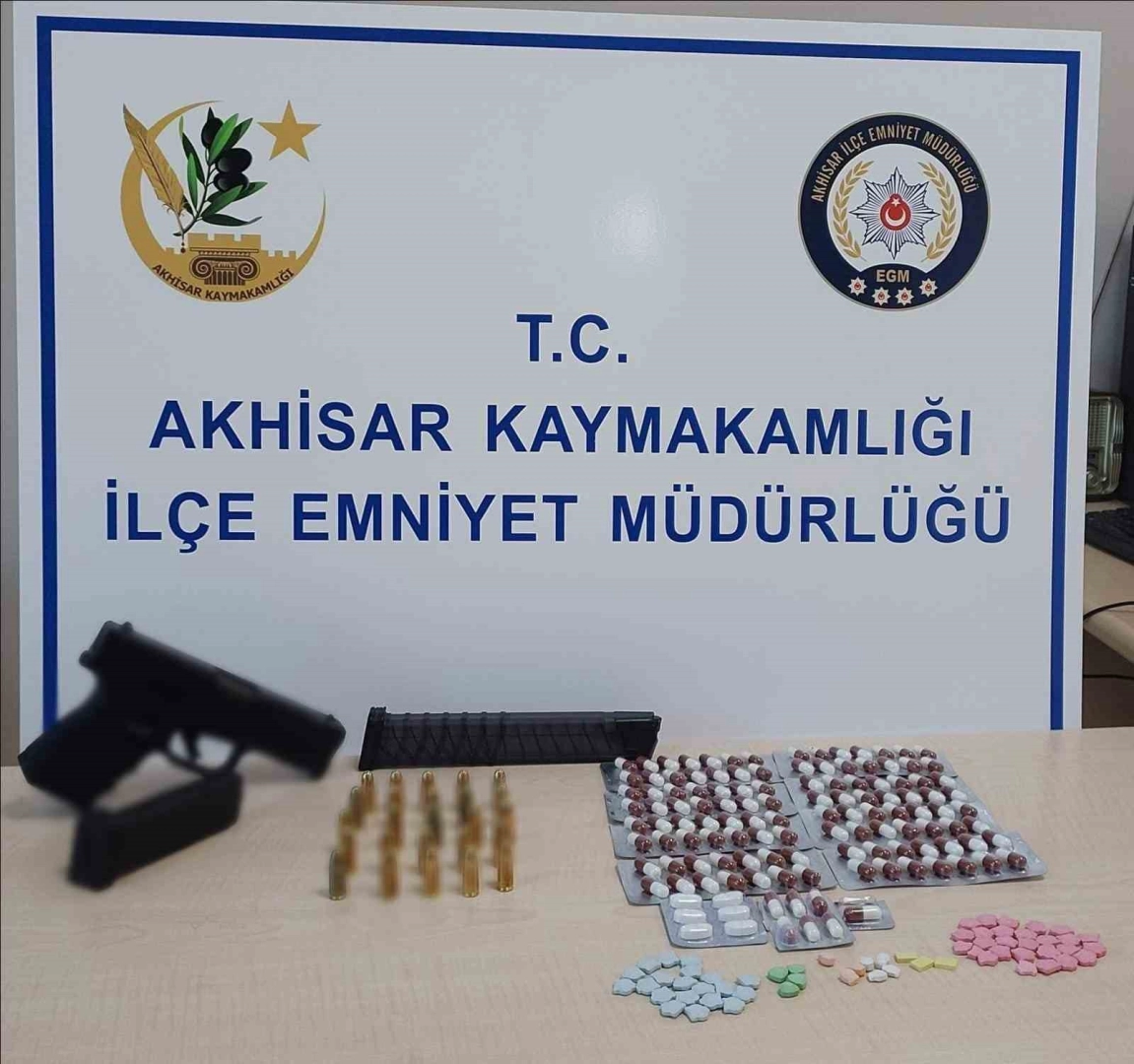 Manisa’nın Akhisar ilçesinde Manisa İl Emniyet Müdürlüğü Akhisar İlçe Emniyet Müdürlüğü ekipleri tarafından şüphe üzerine durdurulan araçtan çok sayıda uyuşturucu madde ile bir adet silah yakalandı. 27 yıl 5 ay 10 gün hapis cezasıyla arandığı tespit edilen araç sürücü ise gözaltına alındı.Manisa İl Emniyet Müdürlüğü Akhisar İlçe Emniyet Müdürlüğü ekipleri yol uygulaması yaptıkları sırada şüphelendikleri aracı durdurarak araçta arama yaptı. Yapılan aramalarda araç içerisinde 1 adet ruhsatsız tabanca ve tabancaya ait 2 adet şarjör, 25 adet mermi, 118 adet sentetik ecza, 61 adet ecstasy hap ele geçirildi. Araç sürücüsü H.A. (49) isimli şahsın yapılan GBT sorgusunda,Tarsus İlamat ve İnfaz Bürosunca Tasarlayarak Öldürme suçundan 27 Yıl 5 Ay 10 Gün kesinleşmiş hapis cezası ile arandığı tespit edildi. Gözaltına alınan H.A. işlemlerinin ardından adliyeye sevk edilecek.