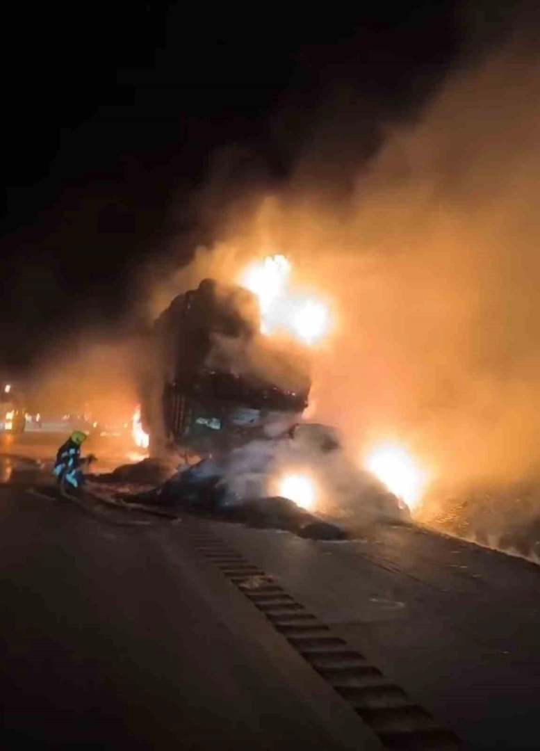 Mersin’in Tarsus ilçesinde saman yüklü tırda yangın çıktı.Alınan bilgiye göre otoyol Tarsus-Pozantı istikameti Damlama yokuşuna varmadan L.D.’nin sürücülüğünü yaptığı 27 AEJ 096 çekici, 06 CTP 705 dorse plakalı saman yüklü tırda seyir halindeyken henüz bilinmeyen bir nedenle yangın çıktı.Durumu fark eden sürücü aracı güvenlik şeridinde durdurdu.İhbar üzerine olay yerine Mersin Büyükşehir Belediyesi itfaiye ekipleri sevk edildi. Ekipler uzun uğraşlar neticesinde alevleri söndürdü. Olayda maddi hasar meydana geldi.