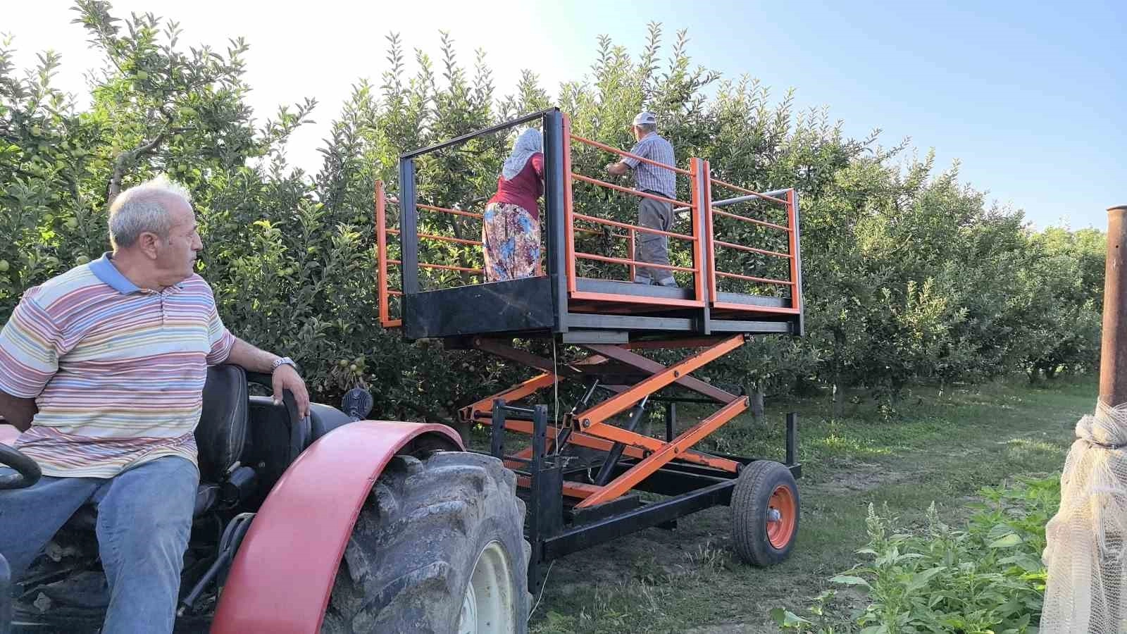 Bursa’nın İnegöl ilçesinde 40 yıldan bu yana çiftçilikle geçimini sürdüren Mehmet Alkan, tasarladığı asansör sistemiyle meyve hasadı süresini yüzde 40 oranında azalttı, mevsimlik işçi sayısını da yarıya indirdi.Çiftçi Mehmet Alkan 3 yıl boyunca kafasında tasarladığı sistemi 15 gün içinde gerçekleştirdi. Oğlu Kağan Alkan’ın metal atölyesinde montajını yaptığı ve torunu Atlas’ın ismini verdiği ürün hasadı için kullanılan asansörle hasada başlayan çiftçi Alkan, iş yükünü yarı yarıya indirdi.Tasarladığı asansörden bahseden Mehmet Alkan, "Yıllardan beri işçi bulmakta problem yaşıyorduk. Ağaca çıktığı zaman riskli oluyor, düşme tehlikesi oluyor. Bunlar için kafamda 3-4 yıldan beri düşünüyorum. Kafamda böyle bir proje olduğunu makine mühendisi gelinime söyledim. O da fikirler verdi ve en sonunda karar verdik. Boyu 3 metre ve 4 kişi alabiliyor. Bunlar daha çok açılıp, 3 metreye yakın yükseliyor. Yükseldiği zaman yanlar açılıyor. Bunları kafamda tasarladım. Bir asansör yapalım dedik, en sonunda yaptık. İşçiler de çok memnun kaldı. Düşme tehlikeleri yok, geldikleri zaman ’yorulmuyoruz’ diyorlar. Yüzde 60 işçi tasarrufu da sağladı. Daha önceden 48 yevmiye veriyordum. Şu an 25 yevmiyeyle tamamladık. Oğlum kaynak işi yapıyordu, amatör kaynak makinesinde yaptık. Bu projenin baştan sona yapılması 15 gün sürdü. İlk seferde başarılı olamadık. Yamulttuk, açtırmasını yaptık, piston yeri oturmadı, kafa kırıldı derken bayağı bir zaman harcadık. Ar-ge biraz daha zor oluyor. Şu an çok rahat. Emeği geçen herkese teşekkür ediyorum. Çok emek harcadık" dedi.Asansörü 190 bin liraya geliştirdiğini aktaran Alkan, "Birkaç arkadaş yapsak nasıl olur dedi. Soranlar çok oluyor. Soranlara oğlumla görüşün dedim. Benim yıllardır hayalimdi. Gayet rahat oldu. Şurada bir vişne ağacı vardı. Hanım dedi ki ’asansör götürürsen toplarım’ dedi. O bile asansöre hayran kaldı" şeklinde konuştu.