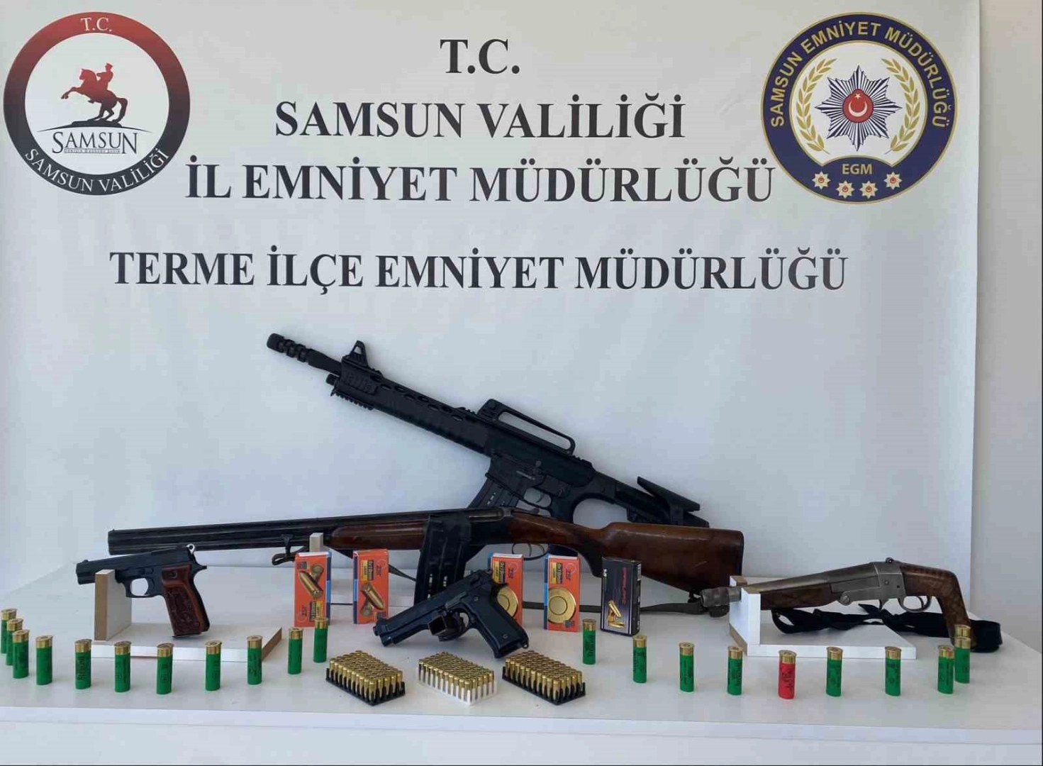 Samsun’un Terme ilçesinde polis tarafından düzenlenen huzur operasyonunda silah ele geçirildi.Edinilen bilgiye göre, Terme İlçe Emniyet Müdürlüğü ekipleri, ilçedeki mevcut huzur ve güven ortamının korunması ve vatandaşların huzur içinde yaşamalarını sağlamak amacıyla huzur operasyonu düzenledi. 6 ikamette yapılan aramalarda, 1 adet ruhsatsız tabanca, 1 adet kurusıkı tabanca, 3 adet ruhsatsız tüfek, 428 adet tabanca fişeği, 24 adet tüfek kartuşu ve 2 adet kurusıkı fişeği ele geçirildi. Olayla ilgili yakalanan 8 şüpheli hakkında adli ve idari işlem başlatıldı.