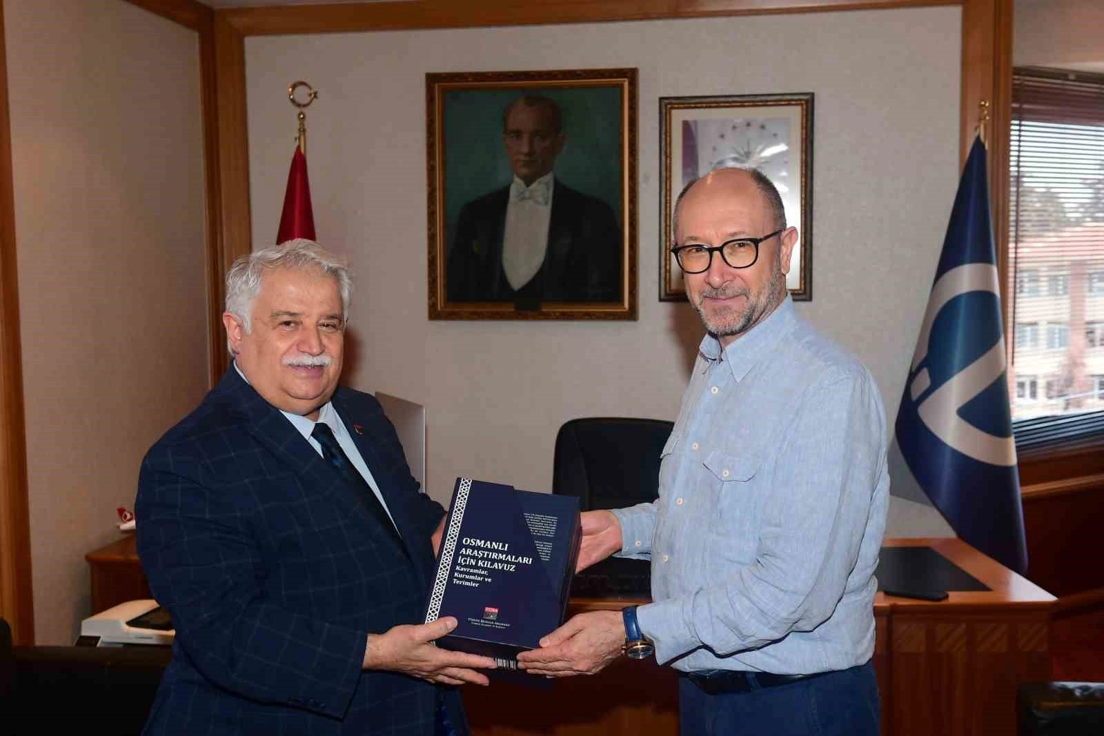 Türkiye Bilimler Akademisi (TÜBA) Başkanı Prof. Dr. Muzaffer Şeker, Anadolu Üniversitesi Rektörü Prof. Dr. Fuat Erdal’ı makamında ziyaret etti.TÜBA Başkanı Prof. Dr. Muzaffer Şeker, Anadolu Üniversitesi Rektörlüğüne yeniden atanan Prof. Dr. Fuat Erdal’ı ziyaret etti. Hayırlı olsun dileklerini ileterek Anadolu Üniversitesinin de ortağı olduğu “Yükseköğretim Öğrencilerini, Özel Gereksinimli Bireyler için Dönüştürücü Kültürel Deneyimler Oluşturacak Şekilde Yetiştirmek” başlıklı proje hakkında fikir alışverişinde bulundu.Ziyaretleri için TÜBA Başkanı Prof. Dr. Muzaffer Şeker’e teşekkürlerini ileten Rektör Erdal, yeni dönemde de TÜBA ile ülkemiz yararına önemli projelerde iş birliklerini devam ettireceklerini dile getirdi. Ziyaret sonunda TÜBA Başkanı Prof. Dr. Muzaffer Şeker TÜBA tarafından hazırlanan “Osmanlı Araştırmaları İçin Kılavuz: Kavramlar, Kurumlar ve Terimler” yayınını Rektör Erdal’a hediye etti.