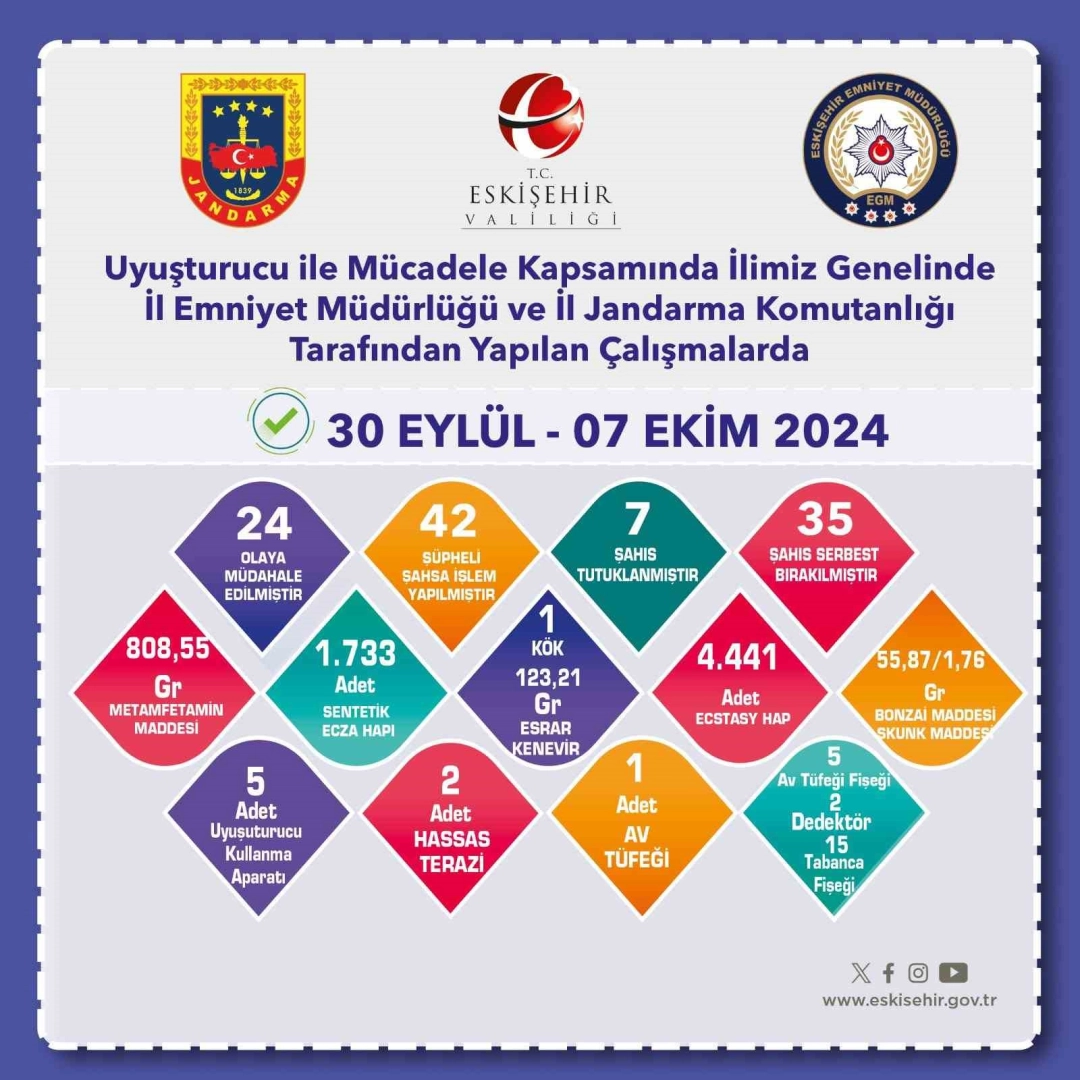 Eskişehir’de polis ve jandarma ekiplerinin uyuşturucuyla ilgili gerçekleştirdiği çalışmalar sonucunda 42 şahsa işlem yapılırken, 7 şüpheli tutuklanarak cezaevine gönderildi.Edinilen bilgilere göre, uyuşturucu ile mücadele çerçevesinde Eskişehir İl Emniyet Müdürlüğü ve İl Jandarma Komutanlığı ekipleri tarafından çalışma gerçekleştirildi. Kent genelinde 30 Eylül ila 7 Ekim tarihleri arasında yapılan çalışmalarda; 24 olaya müdahale edilip, 42 şahsa işlem yapılıp, 7 şüpheli tutuklandı ve 35 şahıs serbest bırakıldı. Ekiplerce ayrıca; 808,55 gram metamfetamin, bin 733 sentetik ecza, 1 kök, 123,21 gram esrar, 4 bin 441 ecstasy hap, 55,87 gram bonzai, 1,76 gram skunk, 5 uyuşturucu kullanma aparatı, 2 hassas terazi, 1 av tüfeği, 5 av tüfeği fişeği, 2 dedektör ve 15 tabanca fişeği ele geçirildi.