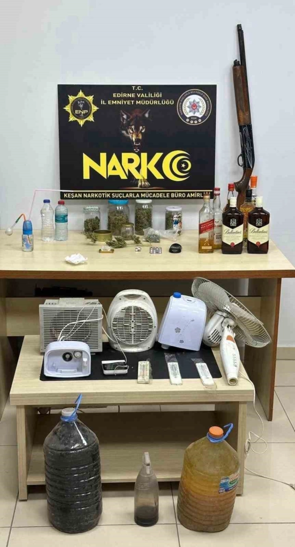 Edirne’nin Keşan ilçesinde, polis ekiplerince düzenlenen operasyon sonucunda bir iş yerinde uyuşturucu ve kaçak ürünler ele geçirildi. Operasyonda gözaltına alınan iş yeri sahibi tutuklandı.Keşan Narkotik Büro Amirliği ve İstihbarat Şube Müdürlüğü’nün koordineli çalışmalarıyla, Keşan Sanayi Sitesi’nde bulunan bir oto elektrikçiye ait iş yerine yapılan baskında iş yeri sahibi Y.Ç.’nin uyuşturucu madde bulundurduğu tespit edildi. Aramada yazıhanede 1 kilogram 972 gram esrar, 18 adet sentetik ecza hap, 6 adet ecstasy hap, 1.12 gram kenevir tohumu, 1 hassas terazi, 1 av tüfeği ve çeşitli kaçak içkiler ele geçirildi.İş yeri binasının ikinci katında ise esrar yetiştirilmek üzere hazırlanmış özel bir düzenek bulundu. Bu düzenekte 2.20x2.40 santim boyutlarında çadır, ısıtıcı, buhar makinesi, vantilatör, termometreler, tavan led lambaları, toprak dolu pet bidonlar ve besleyici sıvılar bulundu.Olayla ilgili gözaltına alınan Y.Ç. çıkarıldığı adli makamlarca tutuklanarak Edirne Kapalı Cezaevi’ne sevk edildi.