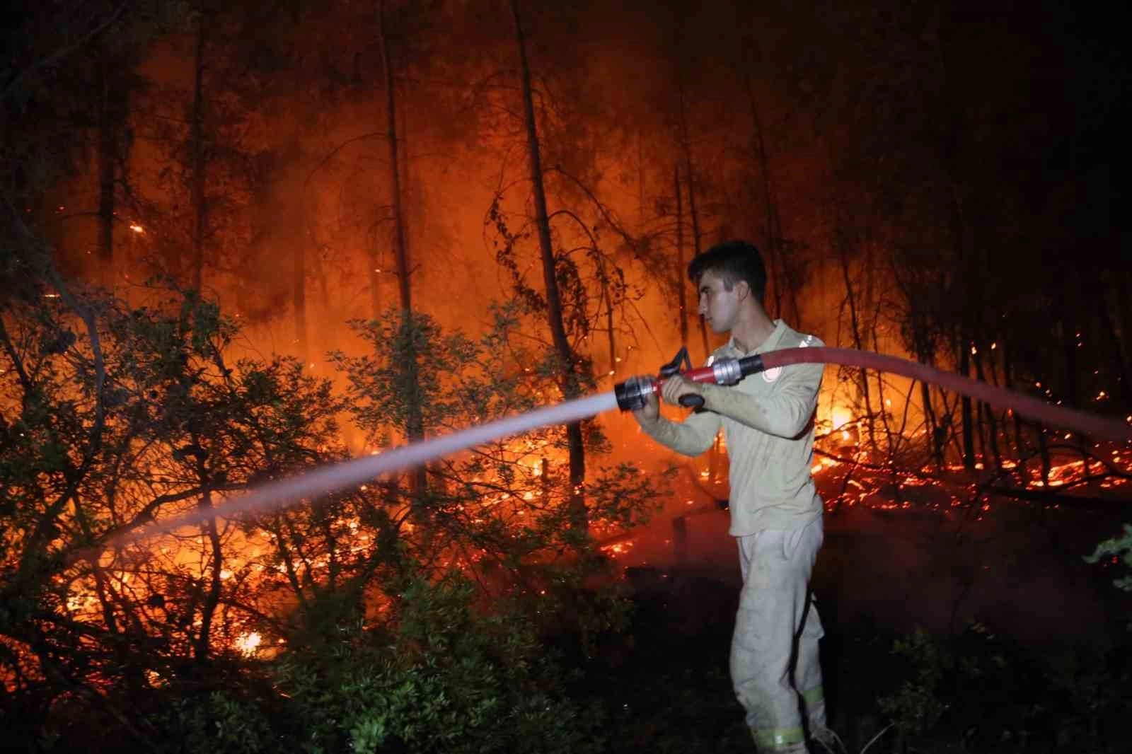 Muğla’nın Milas ilçesinde başlayan ve rüzgarın etkisi ile yayılan orman yangını gece saatlerinde de havadan ve karadan alevlerin kontrol altına alınması için çalışmalar devam ediyor.Yer ekipleri arazözler kanalıyla alevlere müdahale ederken, iki adet gece görüşlü helikopter de havadan müdahalesini sürdürüyor. Çıkarılan Mahallesi sınırına kadar gelen alevlerin mahalleye sıçramaması için yoğun çaba harcanıyor. Havadan iki helikopter, karadan da arazöz ve itfaiye ekipleri alevlerle kıyasıya mücadele ederken, şiddetli rüzgar nedeniyle yangın kontrol altına alınmakta güçlük çekiliyor.Çakıralan Mahallesi çevresinde çok sayıda arazöz, itfaiye, su tankeri ve iş makineleri önlem alırken, gece boyunca alev savaşçılarının alevlere karşı mücadelesi devam edecek. Rüzgarın dinmesi beklenirken, sabahın ilk ışıkları ile çok sayıda uçak ve helikopter havadan müdahaleye devam edecek.
