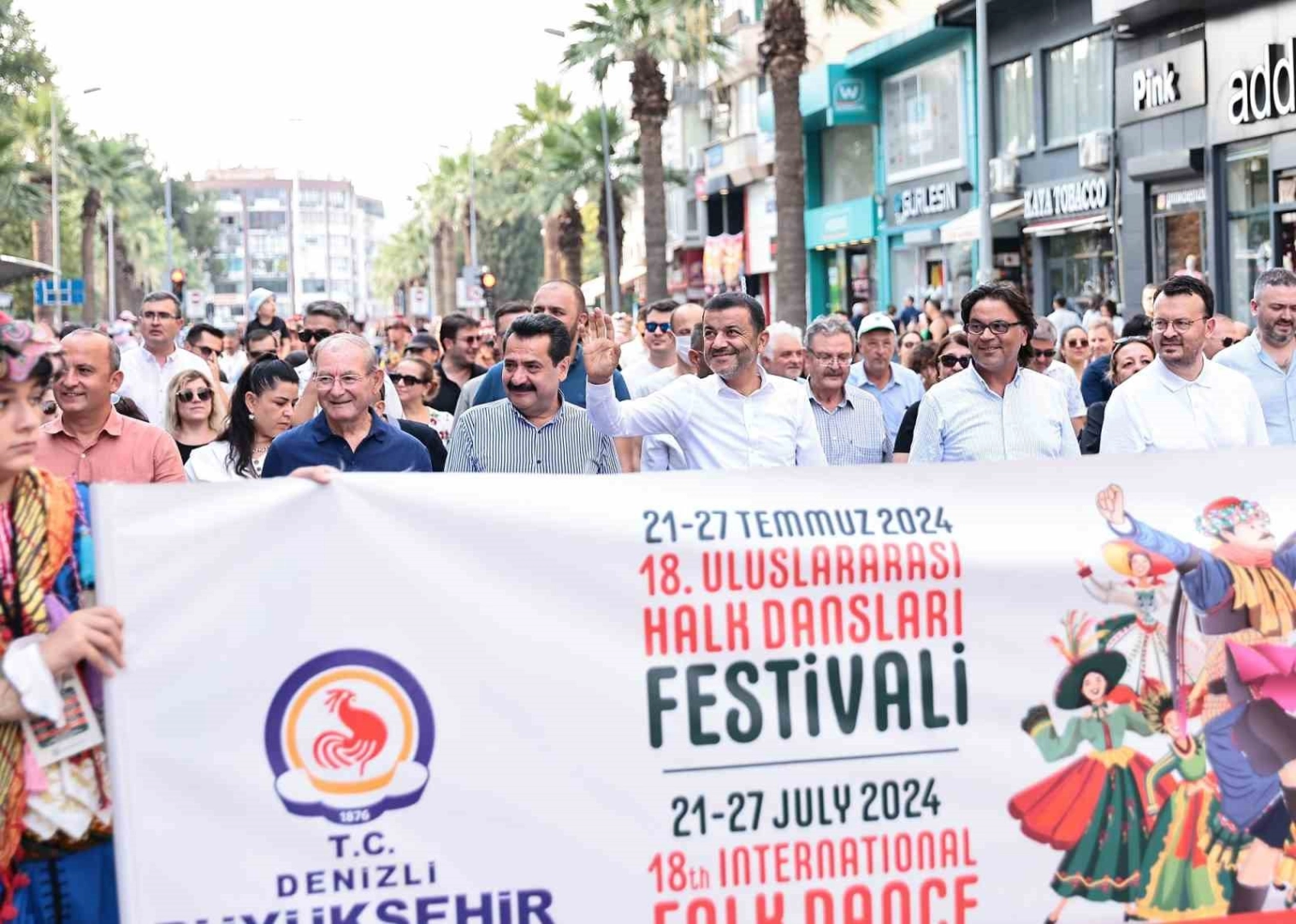 Denizli Büyükşehir Belediyesi 18. Uluslararası Halk Dansları Festivali kortej ile başladı. Denizlililerin dansa doyacağı festivale 12 ülkeden 392 dansçı katılıyor.Denizli Büyükşehir Belediyesinin bu yıl 18’incisini düzenlediği Uluslararası Halk Dansları Festivali kortej ile başladı. Kortej öncesi ise Valilik önündeki Atatürk Anıtı’nda çelenk töreni yapıldı. Denizli Valiliği önünden başlayan korteje, Denizli Milletvekili Şeref Arpacı, Denizli Büyükşehir Belediye Başkanı Bülent Nuri Çavuşoğlu, Başkanvekili Ali Marım, CHP Denizli İl Başkanı Ali Osman Horzum, Pamukkale Belediye Başkanı Ali Rıza Ertemur, Merkezefendi Belediye Başkan Yardımcısı Osman Bartal, Büyükşehir Belediyesi Genel Sekreteri Bülent Bozbaş, davetliler ve festivale katılan 12 ayrı ülkenin halk dansı sanatçıları katıldı.Renkli görüntülerin yaşandığı kortejde dansçılar ülkelerine özgü dansları sergilerken, etkinliğe yoğun ilgi gören vatandaşlar bu güzel anları çektikleri fotoğraf ve görüntülerle ölümsüzleştirdi. Müzik ve danslarla birlikte devam eden coşkulu yürüyüş Denizli Büyükşehir Belediyesi önünde son buldu. Denizli Büyükşehir Belediye Başkanı Bülent Nuri Çavuşoğlu burada yaptığı konuşmada böylesine önemli bir festivale ev sahipliği yapmaktan büyük bir mutluluk duyduklarını söyledi. Başkan Çavuşoğlu, “Umut ediyorum ki festivalimiz her geçen günü daha da güzelleşen bir Denizli’ye mutluluk kaynağı olur. Bugün on bir ülkeden, on bir renkten, on bir dünyanın sevgi gönüllüsü olan, barış elçisi olan, birlikte mutluluğun daha da büyüdüğüne inanan bu güzel dostlarımızla beraber festivalimiz daha eğlenceli, daha güzel günlere ilerleyecektir. Artık hep birlikte güzelliğin paylaşıldığı, dünyanın sevgi diliyle egemen hale geldiği bir Türkiye, bir Denizli yolculuğumuzun her geçen gün daha da artarak süreceğine inanıyorum” diye konuştu.Büyükşehir Belediye Başkanı Bülent Nuri Çavuşoğlu konuşmasında barış mesajı vererek, festivalin güzellikler getirmesini diledi. Başkan Çavuşoğlu, “Bugün buradan, bu meydandan bir kez daha dünyaya barış çağrısında bulunuyorum. Filistin’de yaşayan kardeşlerimiz ve İsrailli olmasına rağmen Filistin halkına zulüm edilenlere karşı mücadele eden İsrailli dostlarımızla beraber bu ülkede, Filistin’de zulmün, İsrail’i yönetenler tarafından yaşatılan bu zulmün son bulması için bütün dünyaya ve bütün insanlığa bir kez daha çağrıda bulunuyoruz. Biz istiyoruz ki, halkların kardeş olduğunda bu dünyada sömürgeci güçlerin yaşama şansı olmayacaktır. Festivalimiz de birlikte barışın tüm dünyaya yayıldığı ve insanların birbirini sevgiyle kucakladığı, kendi gemisini kurtaranların kaptan olduğu değil, hep beraber olduğumuzda mutlu olduğumuzu görecek dostlarla beraber yeni güzel günlerde görüşmeyi ve festivalimizin Denizli’ye hayırlı olmasını diliyorum” ifadelerini kullandı. Programın ardından 12 ülkeden gelen konukların temsilcileri Başkan Bülent Nuri Çavuşoğlu’nu makamında ziyaret etti.27 Temmuz’a kadar Denizli’ye renk katacak festival programına katılacak gruplar şöyle: “KKTC, Hırvatistan, Arnavutluk, Polonya, Rusya, Kosova, Gürcistan, Kuzey Osetya, Dağıstan, Kuzey Makedonya, Kolombiya, Kuzeyin Uşakları (Ankara) ile ev sahibi Denizli Büyükşehir Belediyesi Konservatuarı Halk Dansları Topluluğu, Denizli Büyükşehir Belediyespor Kulübü Halk Dansları Topluluğu ve 15 Temmuz Şehitler Anadolu Lisesi Spor Kulübü.” Denizli Büyükşehir Belediyesinin 1 hafta boyunca ücretsiz olarak sunacağı festival programı ise şöyle, 22 Temmuz Pazartesi günü, saat 20.30 Acıpayam ve 21.30 Serinhisar’da olucak. 23 Temmuz Salı günü, saat 21.00 İncilipınar Parkı ve saat 21.30 KYK (Amfi Tiyatro)’da olucak. 24 Temmuz Çarşamba günü ise saat 20.30 Sarayköy ve 21.30 Buldan’da olucak. 25 Temmuz Perşembe günü, 21.00 Yenişehir Zaferiye Abalıoğlu İlkokulu ve 21.30 Adalet Parkı’nda olucak. 26 Temmuz Cuma günü ise 20.30 Bozkurt ve 21.00 Çardak’ta olucak. Son gün ise 27 Temmuz Cumartesi günü ise 21.00 Gala Programı, Büyükşehir Belediyesi Nihat Zeybekçi Kongre ve Kültür Merkezi’nde son bulacak.