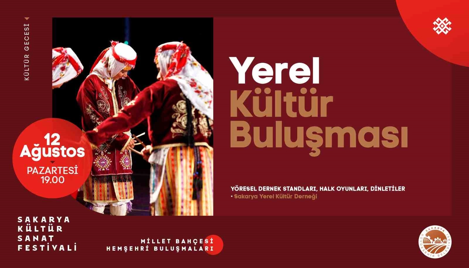 Sakarya Büyükşehir Belediyesi’nin Millet Bahçesi’nde düzenlediği hemşehri buluşmaları 12 Ağustos Pazartesi günü Yerel Kültür Buluşmalarıyla devam edecek.Sakarya Büyükşehir Belediyesi tarafından Millet Bahçesi’nde düzenlenen hemşehri buluşmaları, 12 Ağustos Pazartesi günü Yerel Kültür Buluşması ile sona erecek. Yöresel dernek stantlarının gün boyu açık olacağı hemşehri buluşmaları akşam 19.00’da halk oyunları ve konserlerle devam edecek.