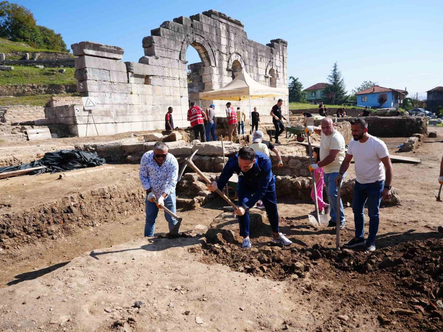 Düzce Belediyesi İtfaiyesi personeli, Düzce’nin ve bölgenin en önemli tarihi ve kültürel miraslarından biri olan Konuralp Antik Tiyatrosu kazılarına katılarak destek verdi.Düzce Belediyesi birimlerinin hafta sonları dönüşümlü olarak katıldığı kazı çalışmalarına bu kez İtfaiye Müdürlüğü destek verdi. İtfaiyesi personelleri, bölgenin tarihi mirasını koruma ve gün yüzüne çıkarma çalışmalarına katkı sunmak amacıyla Konuralp Antik Kenti kazılarına katıldı. İtfaiye ekibi ile birlikte, Başkan Yardımcısı Burak Coşkun da antik tiyatronun giriş kısmında devam eden kazı çalışmalarında yardımcı oldu.Kazı alanına ziyaretDüzce Belediye Başkanı Dr. Faruk Özlü de hafta sonu gerçekleştirdiği saha ziyaretinde kazı alanını gezerek, çalışmaların geldiği son durumu yerinde gördü. Antik Tiyatro’nun üst bölümünde ziyaretçiler için düzenlenen ahşap yürüyüş alanı ve teras ile oturma alanlarını inceleyen Başkan Özlü, karşılaştığı gezi grubu ile sohbet etti. Ardından kazı çalışmalarının yürütüldüğü bölüme geçen Özlü, ekiplere ‘kolay gelsin’ dileklerini ileterek, “Çok harika olacak. Kazılar bittiği zaman insanlar bakınca muhteşem bir eser görecek. İnsanların geldiğine değecek ve iyi ki gelmişim diyecek” ifadelerini kullandı.İtfaiye personellerinin özveri ile katkı sunduğu kazı çalışmalarının yılsonuna kadar tamamlanması ve ardından tarihi bölgenin restore edilmesi planlanıyor.