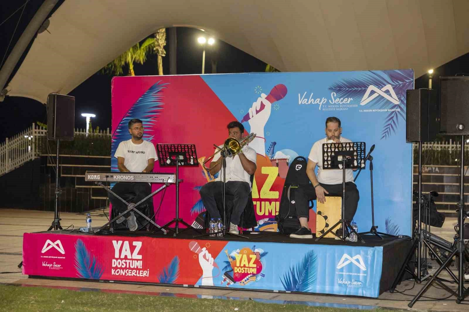 Mersin Büyükşehir Belediyesi, Kent Orkestrası, sahilde verdiği konserle vatandaşlara keyifli anlaş yaşattı.’Yaz Dostum’ konserleri kapsamında kentin her noktasını sanatla buluşturan Kültür ve Sosyal İşler Dairesi Başkanlığı, sahilde sıcak yaz akşamının keyfini çıkaranlara akustik konser ile eşlik etti. Sevilen parçaları akustik versiyonda çalan Kent Orkestrası’nın profesyonel ekibi, sahilde vatandaşlara zaman zaman duygulu anlar yaşatırken zaman zaman da keyifli anlar yaşattı. Ailesi ve arkadaşları ile sahile gelenlere keyifli anlar yaşatan sanatçılar, performanslarının ardından alkışlarla uğurlandı."Sanat sadece sahnede değil, sanat her yerde"Konseri izleyen vatandaşlardan Fatma Togay Akdoğan, açık havada güzel bir etkinlik yaşadıklarını belirterek, "Bu tür etkinliklere kolayca ulaşabilmenin en uygun yolu belediyeler" dedi.Ömür Sevgi Çil de "Sanat sadece sahnede değil, sanat her yerde, hayatın kendisi bir sanat" ifadelerini kullandı.Büyükşehir Belediyesinin hiçbir etkinliğini kaçırmadığını dile getiren Aylin Özdemir ise çocuklarıyla beraber geldiğini söyleyerek, bu tür organizasyonların devamını beklediklerini kaydetti. Pandemi döneminde itibaren bu tarz organizasyonlardan çok keyif aldıklarını vurgulayan Mehmet Apaydın da "Çok keyifliydi, daha fazla konser olmasını istiyoruz" diye konuştu.
