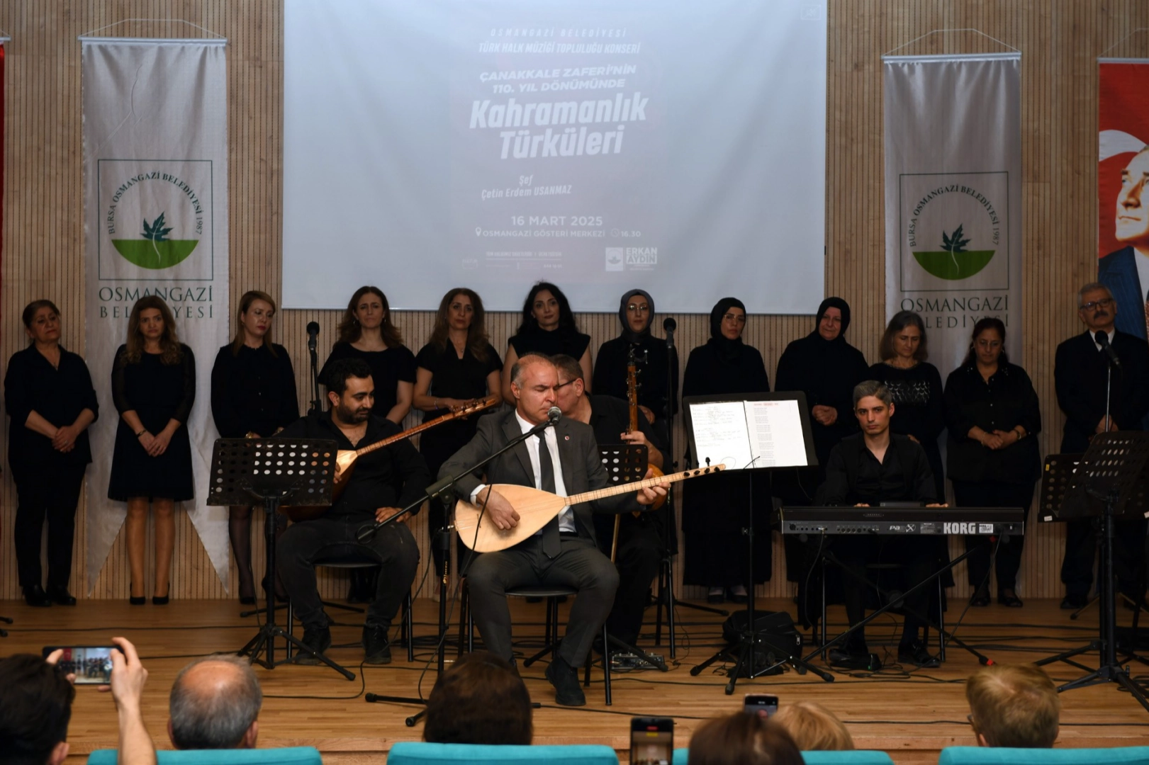 18 Mart Şehitleri Anma Günü ve Çanakkale Deniz Zaferi’nin 110. yıl dönümü, Osmangazi’de şanlı zafere yakışan özel bir etkinlikle kutlandı. Büyük zaferin yıl dönümünde Osmangazi’de kahramanlık türküleri yankılandı. Osmangazi Gösteri Merkezi’nde sahneye çıkan Osmangazi Belediyesi Türk Halk Müziği Topluluğu, seslendirdikleri kahramanlık türküleri ve ağıtlar ile sanatseverlere tadına doyulmaz bir müzik yolculuğu sundu. Şef Çetin Erdem Usanmaz önderliğinde gerçekleşen Kahramanlık Türküleri konserine, Osmangazi Belediye Başkan Yardımcısı Mutlu Esendemir, Gemlik Belediye Başkanı Şükrü Deviren, CHP Osmangazi İlçe Başkanı Raşit Gürbüz, davetliler ve çok sayıda Osmangazili katıldı. Konserde birbirinden özel kahramanlık türkülerini seslendiren koro üyeleri, dinleyiciler tarafından ayakta alkışlandı. Konserde söylenen türkülere ve ağıtlara eşlik eden izleyiciler, zaman zaman duygulandı. Osmangazi Belediye Başkan Yardımcısı Mutlu Esendemir, yaşattıkları unutulmaz gece için koro üyelerini kutlayarak, koro adına Şef Çetin Erdem Usanmaz’a çiçek takdim etti.