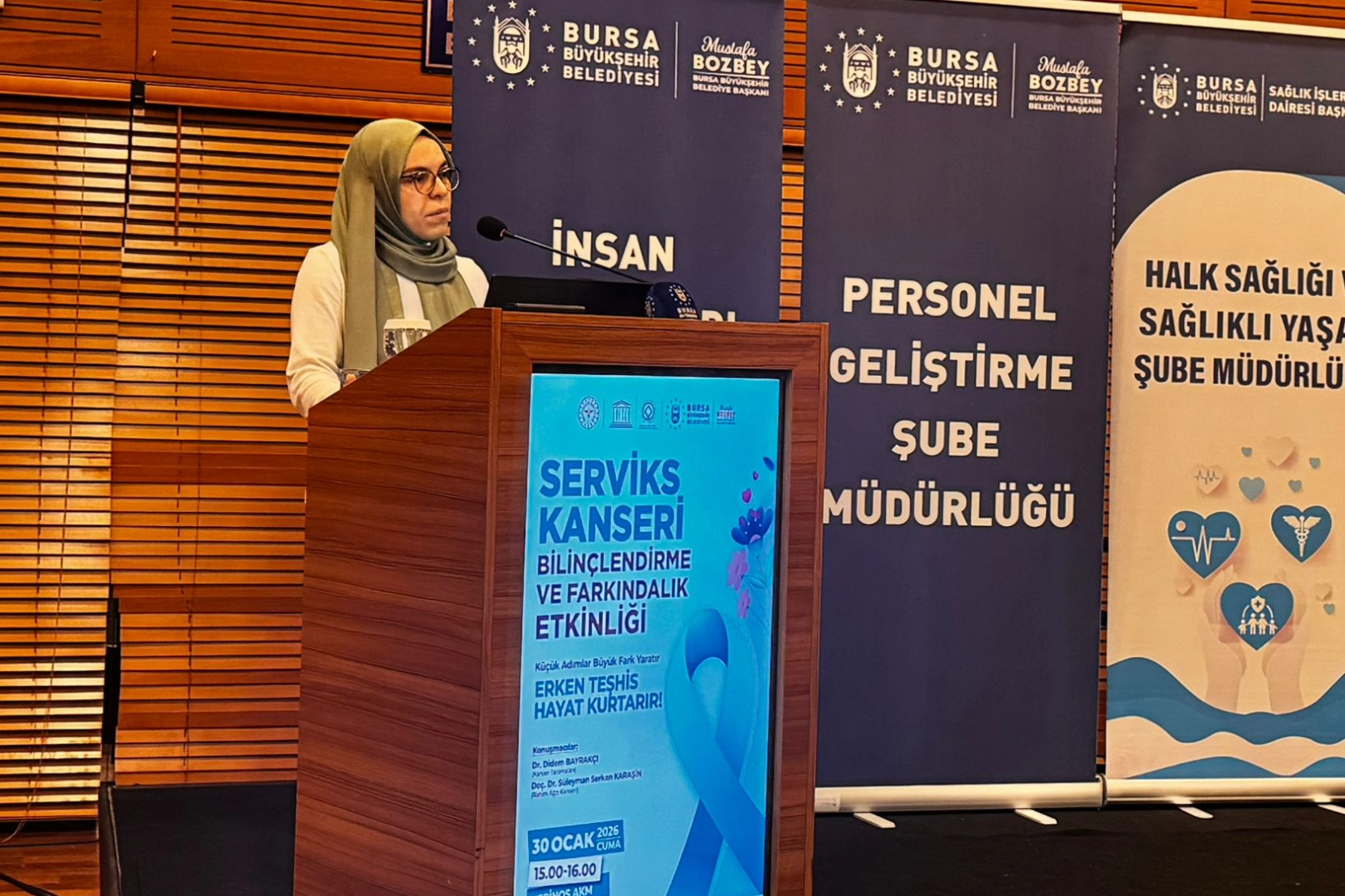 Bursa Büyükşehir Belediyesi, Serviks Kanseri Farkındalık Ayı kapsamında kadın çalışanlara yönelik bilinçlendirme etkinliği düzenledi. Programda erken teşhisin önemi, tarama testleri ve korunma yöntemleri uzmanlar tarafından ele alındı.
